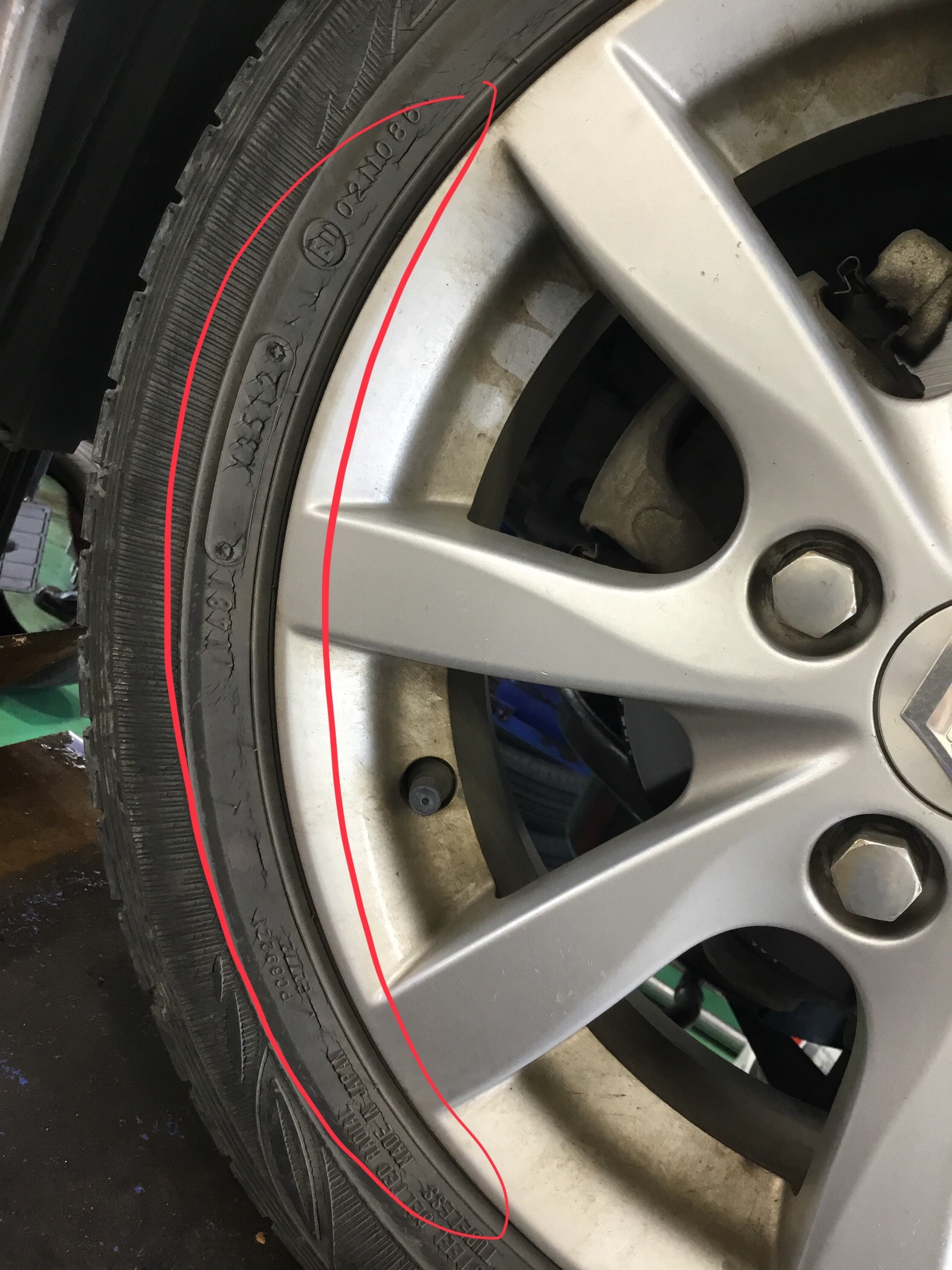 今日はオイル交換に来てくださった一台のお車のタイヤにひび割れを発見しました。