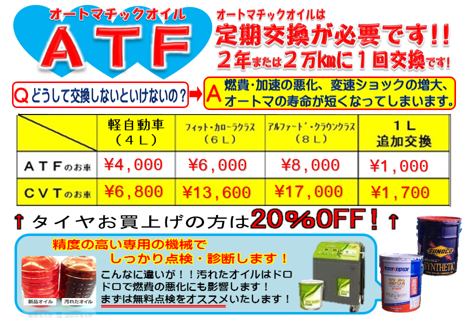 ATF・CVTF(オートマオイル)交換 ポスト オートマオイルを交換したことはありますか? 2年または20,000kmに1度の定期交換が必要です。 高性能なATFチェンジャーでオイルの汚れ・劣化具合をわかりやすく判定! ※画像をクリックすると拡大します。 ※画像に掲載している料金は当社指定オイルで、店舗によりオイルの種類や料金が異なる場合がございます。 詳しくは店舗までお問い合わせくださいませ。 カテゴリ:商品情報 その他メンテナンス