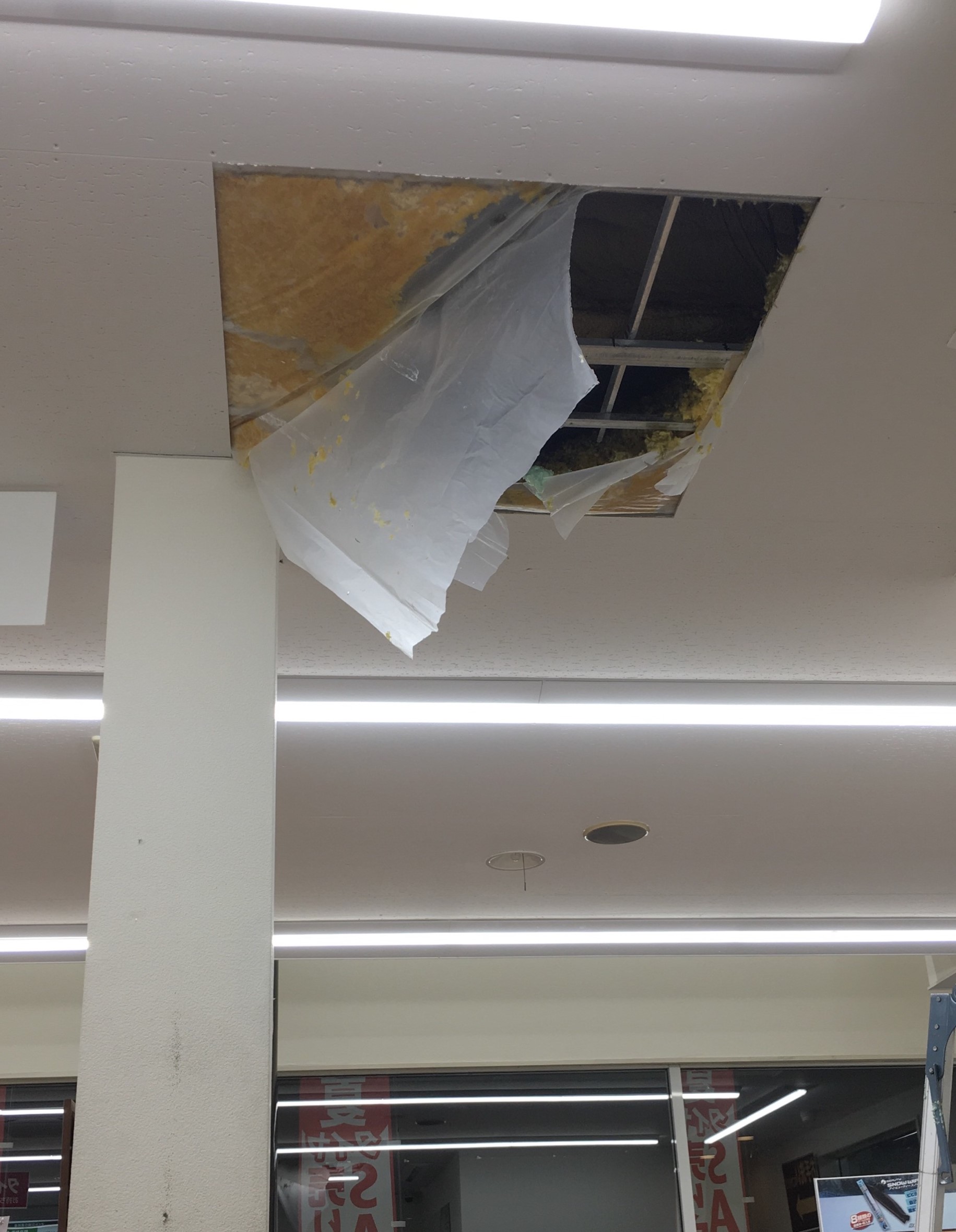 今回はカウンター横プリンターを置いてる真上の天井から激しく雨漏りしていて修理しております。