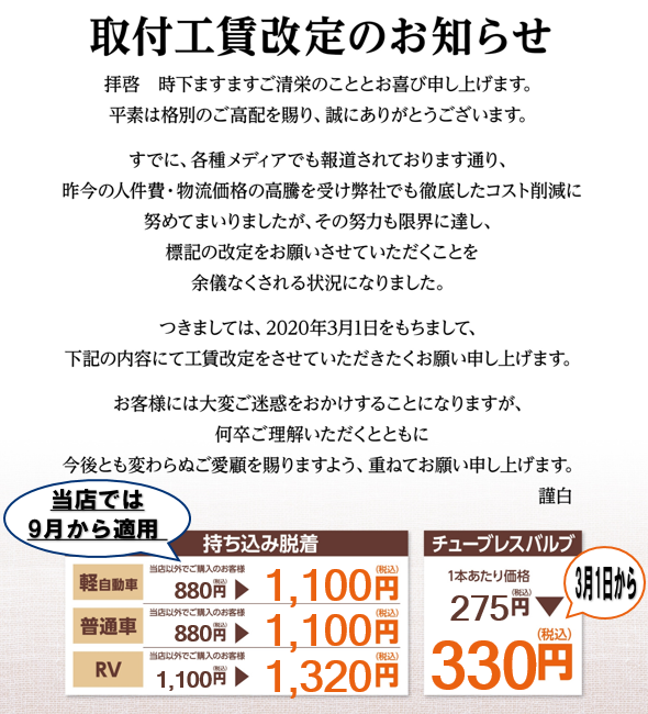 下記画像にあります通り、チューブレスバルブと持ち込み脱着の料金が変更となります。