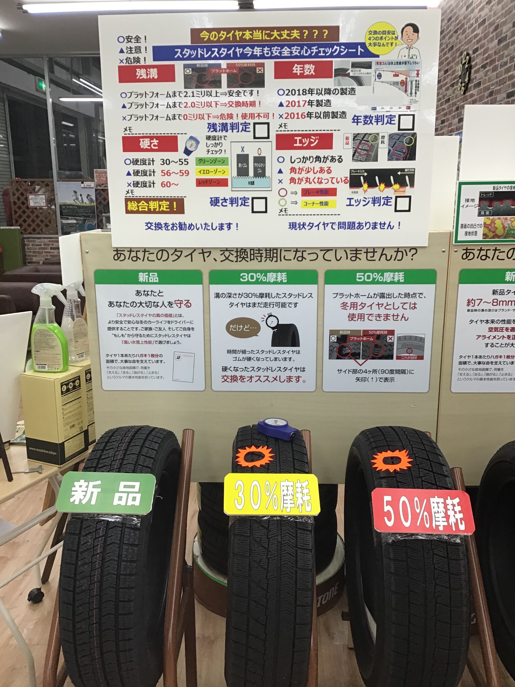 滑りませんか?? ポスト 2021年1月11日 みなさんこんにちは!!田村です! みなさん、今使っているスタッドレスの点検なんてしたことありますか? 知らないうちに実はかなり溝が減っている、、、なんてよくある話なんですよ! 当店では大きく4つの項目に分けてタイヤの点検をしております。 最近なんか滑るな~なんて思った方はもしかしたらかなり減っているかもしれませんよ! 無料で点検しておりますので是非一度ご来店ください!! それでは!! 担当:田村