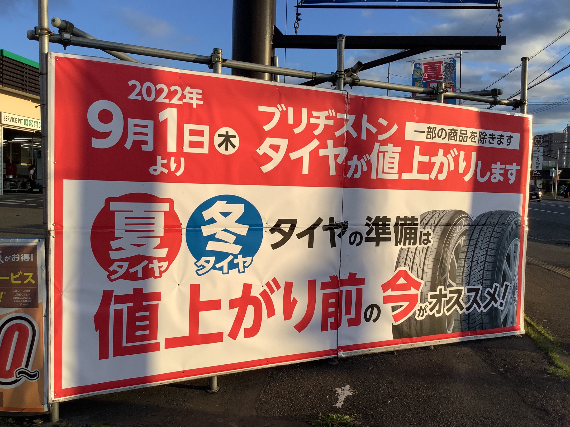 タイヤ値上がり注意報 ポスト 2022年7月19日 皆さんこんにちは! 7月も残り10日ですね。 9月よりタイヤが値上がりしてしまいます(´°̥̥̥̥̥̥̥̥ω°̥̥̥̥̥̥̥̥`) 今の夏・冬タイヤで大丈夫かな?って考えている方は購入するなら今が1番お得です!!! タイヤの状態を点検させて頂き、適切なアドバイスをしますので、先ずはご来店下さいm(_ _)m お待ちしております! 担当:YOSHIDA