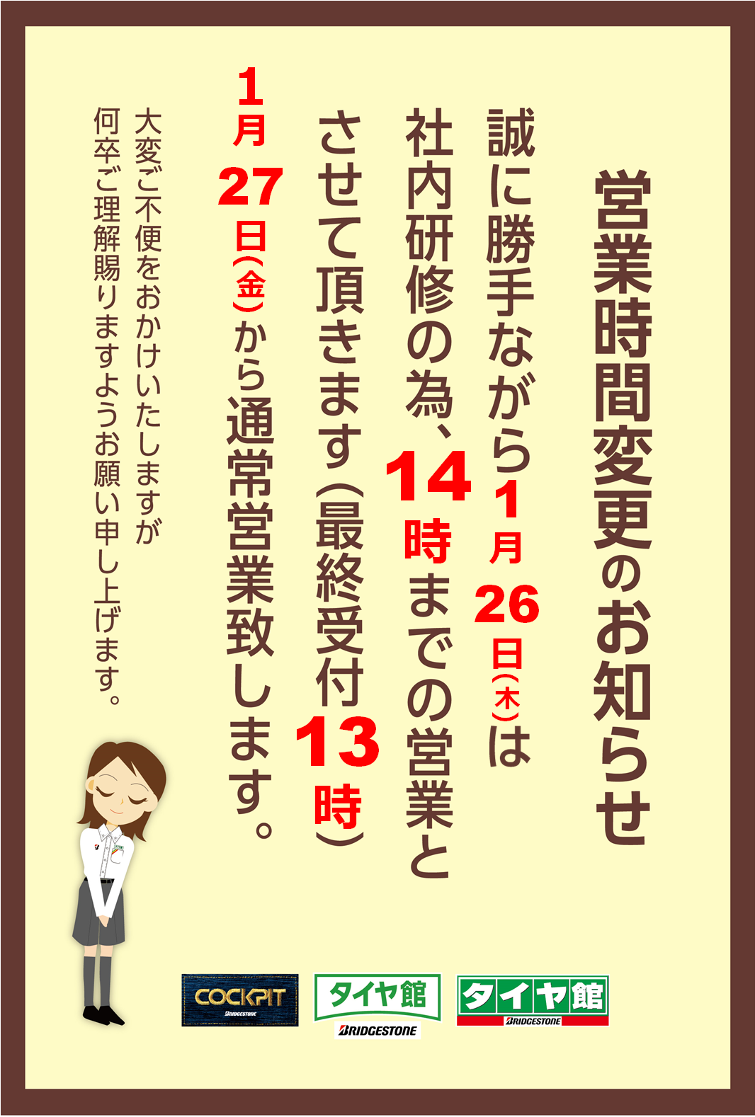 明日26日は営業時間が変更になってます。ご確認お願いします。
