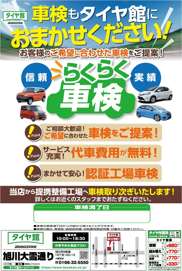 【車検】余裕をもったご予約が大事!事前点検・お見積り が無料 旭川市
