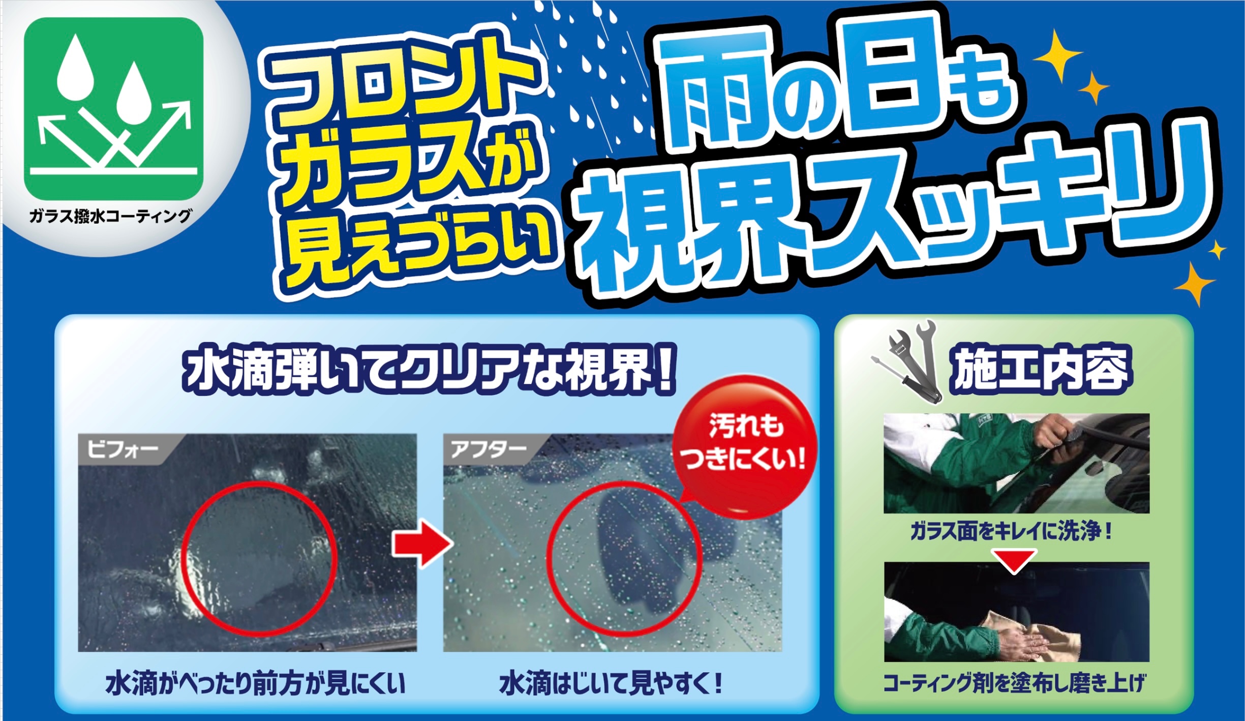 「ガラス撥水」を施工していると水滴を弾きワイパーで拭き取るとしっかり前を見やすくしてくれます!