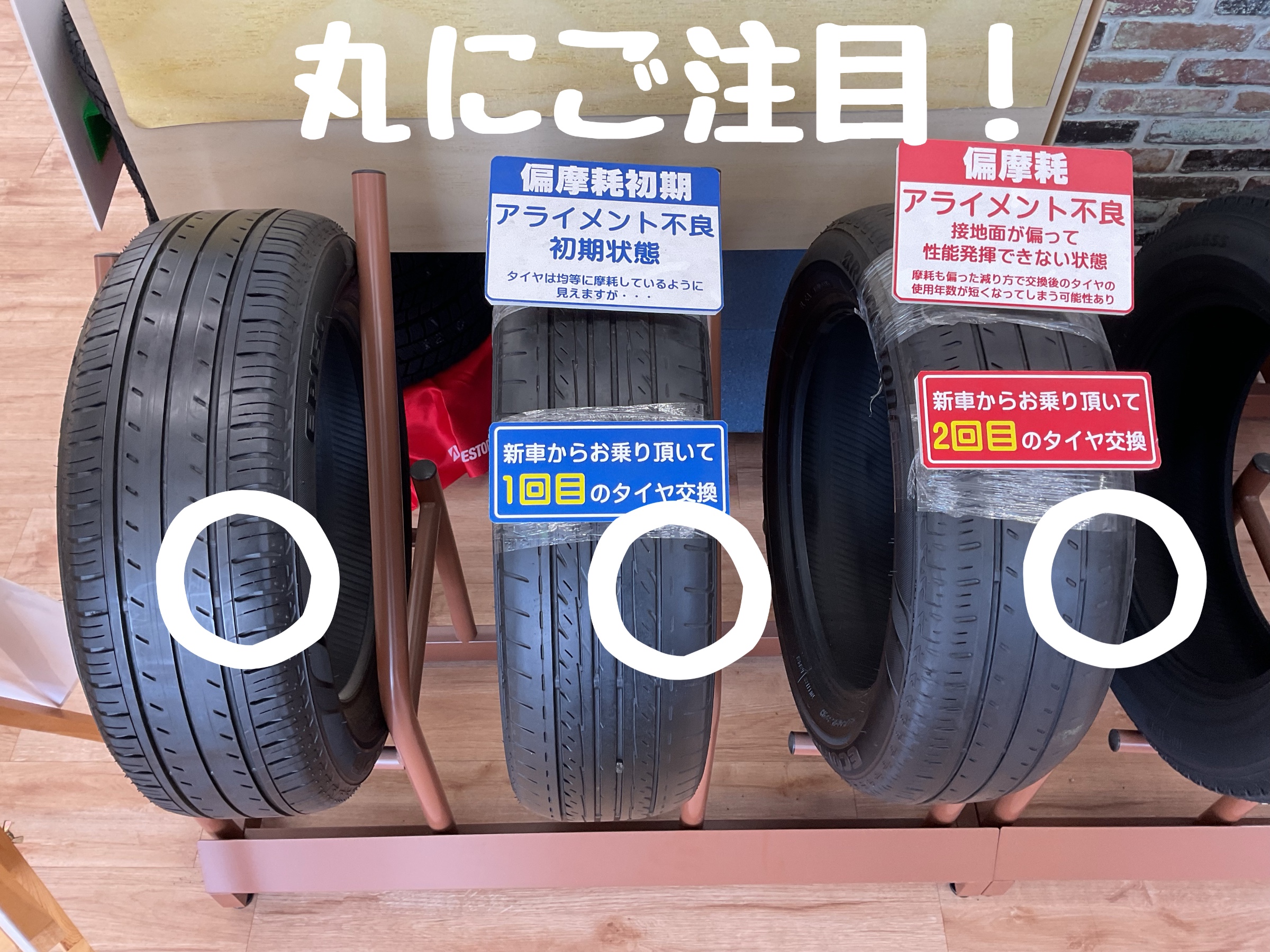 このように新品だとしっかり角のエッジがしっかりあるのですがアライメント不良の場合片減りしてしまいタイヤがダメになってしまいます…