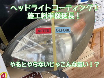1月のヘッドライトコーティングが大好評につきヘッドライトコーティング施工料半額を2月も引き続きやらせていただきます! 期間は2/28(土)まで期間を延長して施行させていただきます^_^ ヘッドライトコーティングをすると、黄ばみや白いくすみをクリアで綺麗なヘッドライトにする事ができます! そ...