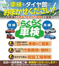 車に乗っていれば必ずある車検! 車検費用気になりますよね… タイヤ館では車検費用を安く抑えて車検を取る事ができます! また、自店ピットでしっかり点検をし見積もりを出せるとこによってあらかじめどのくらい費用がかかるかをお伝えする事ができます! 車検見積もりは無料でできますので、車検が...