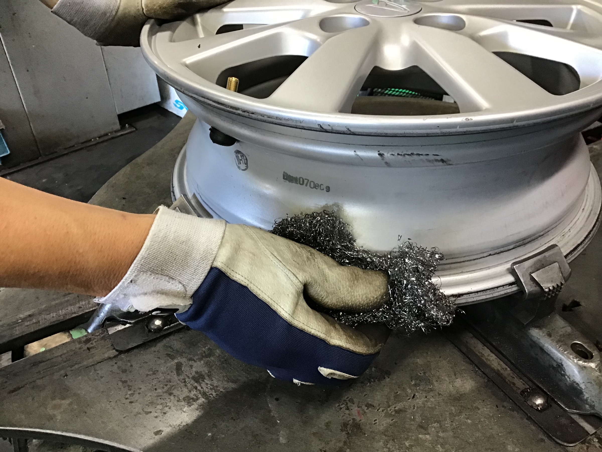 〇タイヤとホイールリム接着部の清掃を行います
