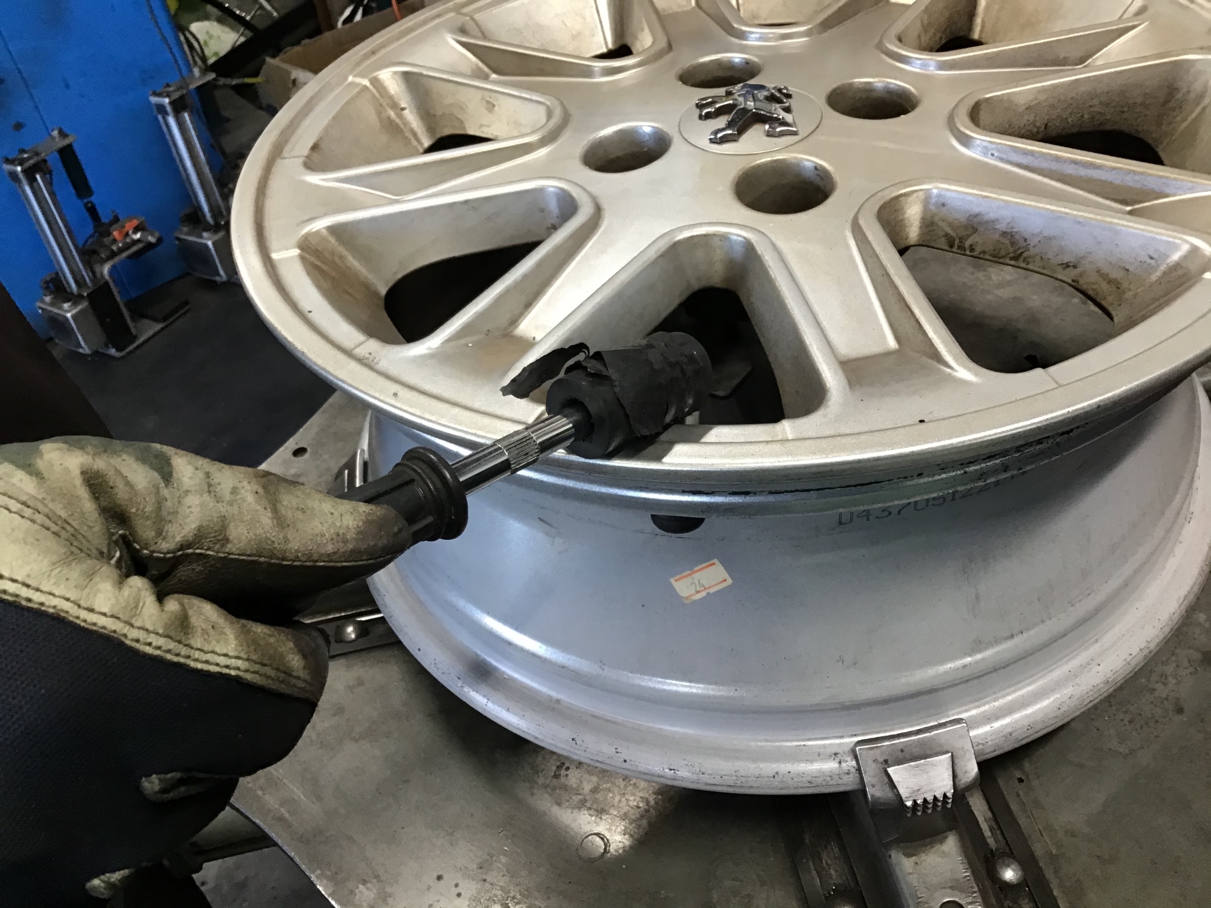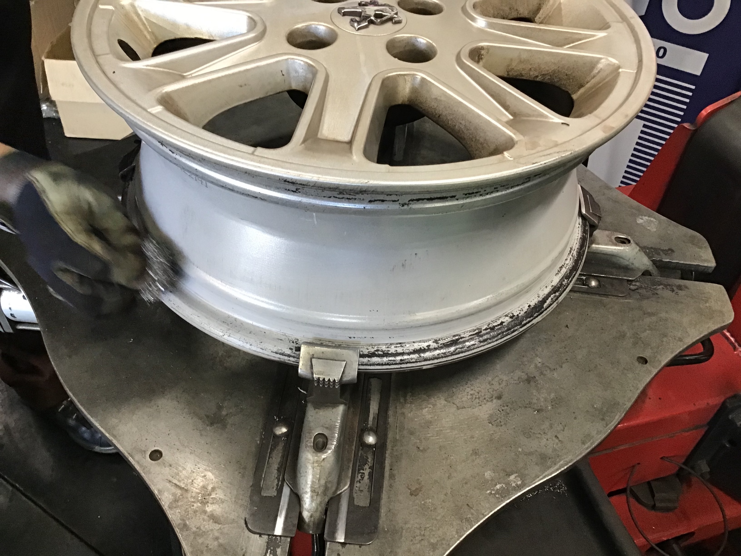 〇タイヤとホイールリム接着部の清掃を行います
