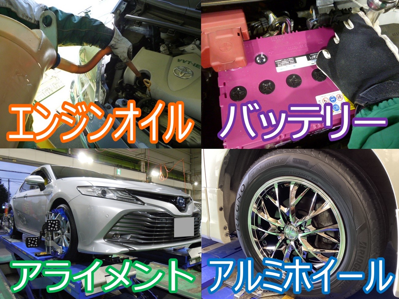 A:タイヤ館ではエンジンオイルやバッテリー等の交換、アルミホイールの取り扱い、アライメント測定&調整なども行っております♪
