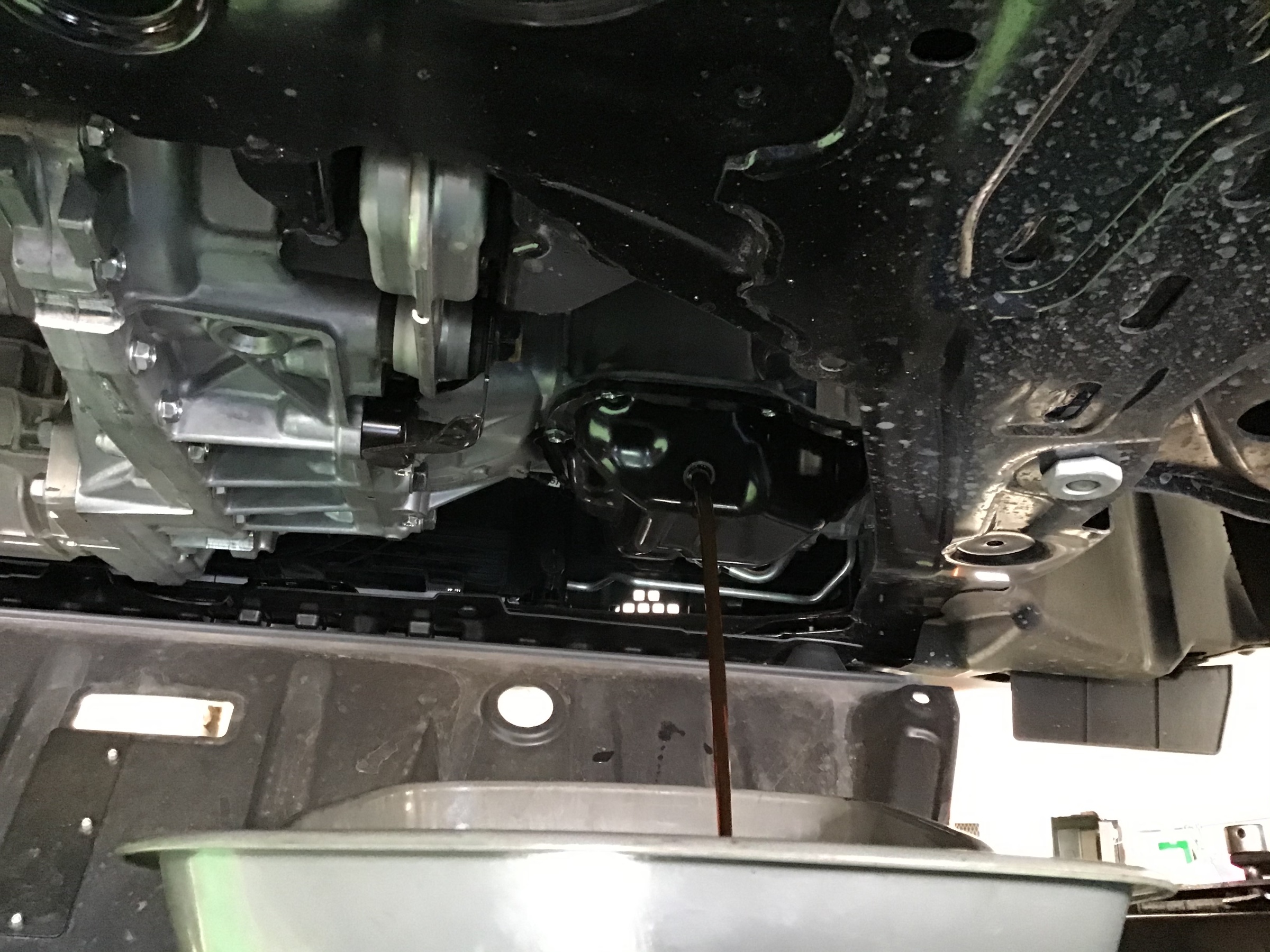 2名体制でオイルエレメント周りからの漏れ確認、オイルゲージでの適量確認、
