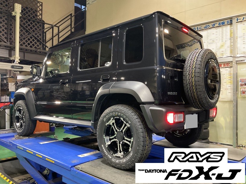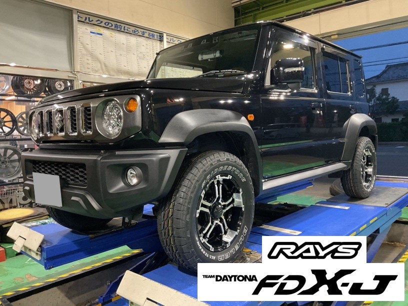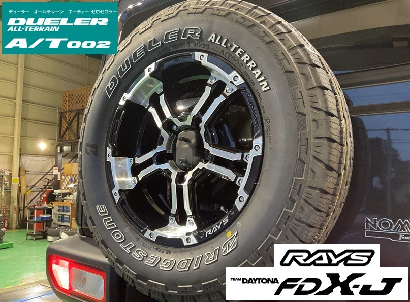 アルミホイールはRAYSのジムニー専用設計【チームデイトナ・FDX-J】を、タイヤは当社ブリヂストンの【デューラーA/T002】お選びいただきました。