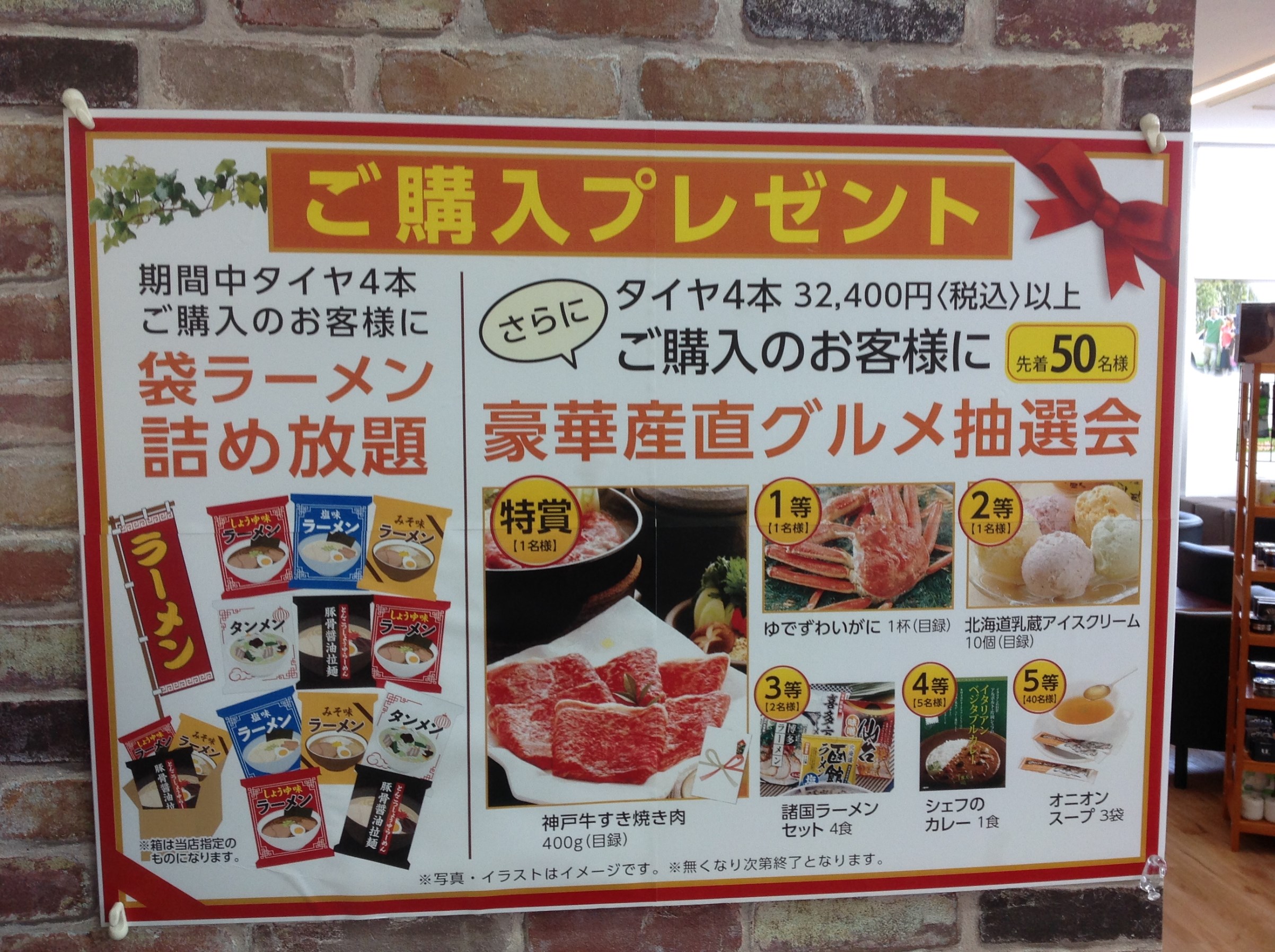タイヤ4本購入時のプレゼントのラーメン詰め合わせや
