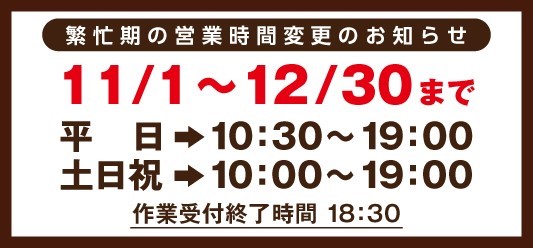 この度、当店では冬タイヤへの履き替えで混雑する11月・12月の営業時間を変更させて頂く事となりました。