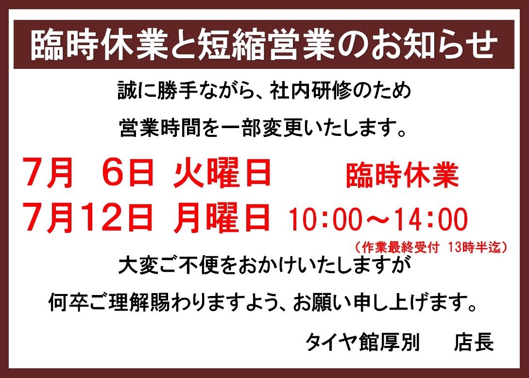 いつもタイヤ館厚別店をご利用いただき誠にありがとうございます。