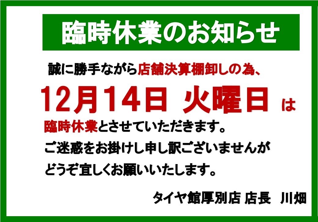 いつもタイヤ館厚別店をご利用いただき誠にありがとうございます。