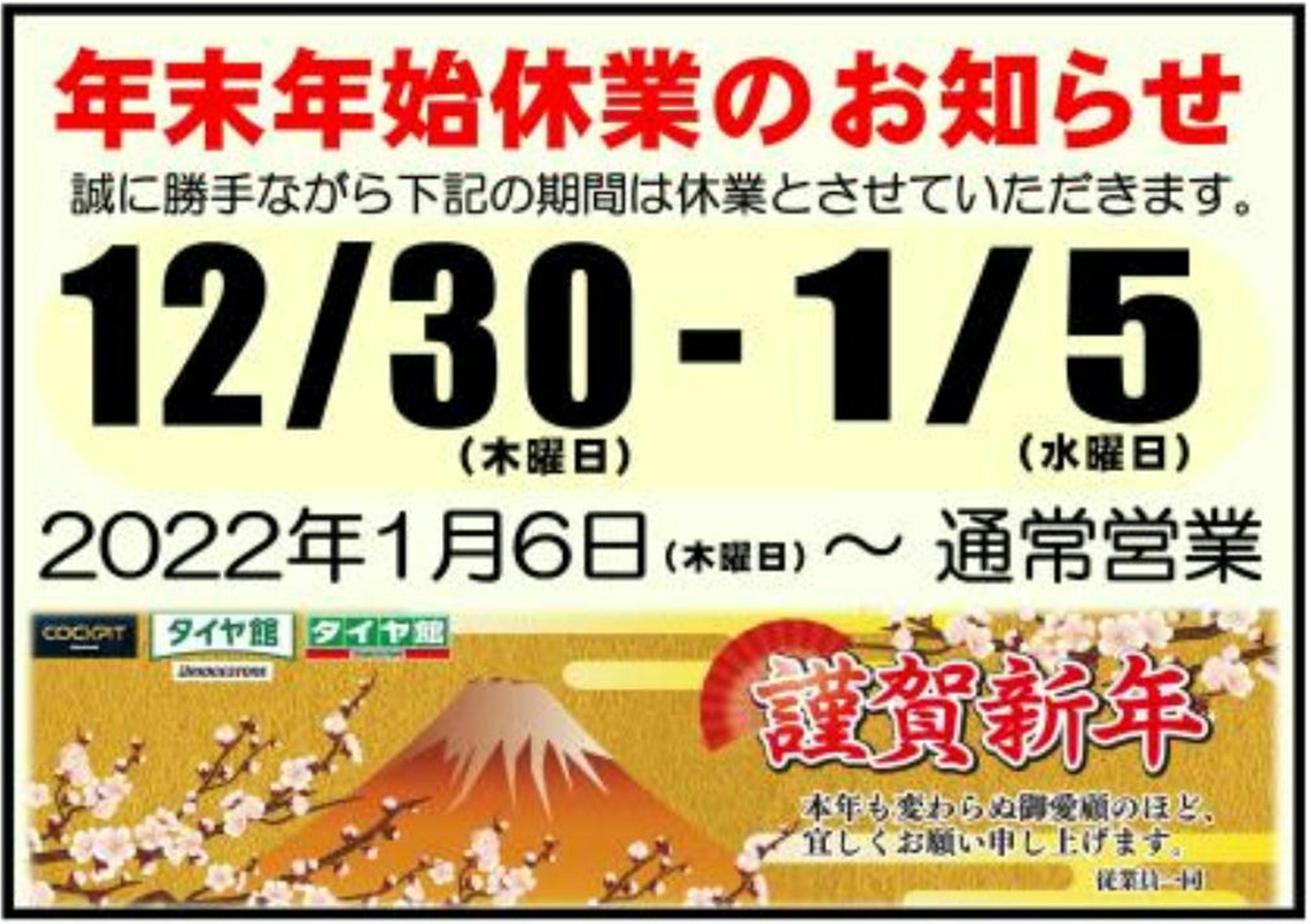 年始休業のお知らせ ポスト 2022年1月5日 タイヤ館厚別のホームページをご覧いただき 誠にありがとうございます! 本日1月5日(水)は年末年始休業のためお休みでございます。 作業予約やお問い合わせ等は2022年1月6日(木)以降にお願い致します。 お手数をお掛け致して申し訳ございませんが ご理解とご協力のほどよろしくお願い致します。 担当:カワハタ
