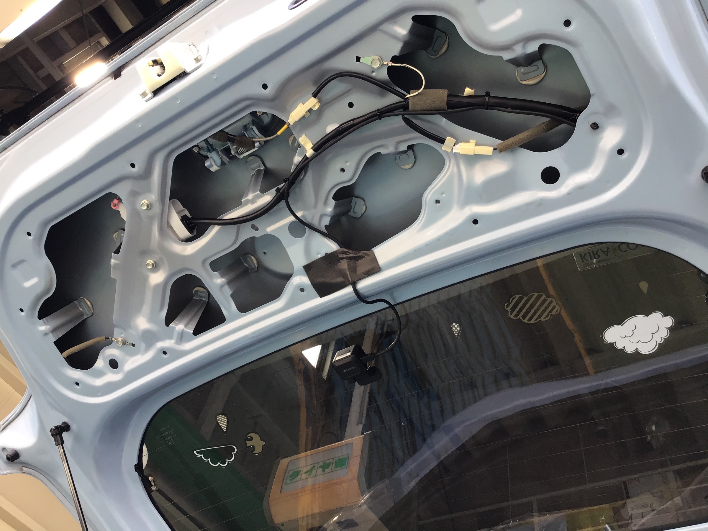 リアハッチの内張を剥がし配線の取り回しの確認をします。
