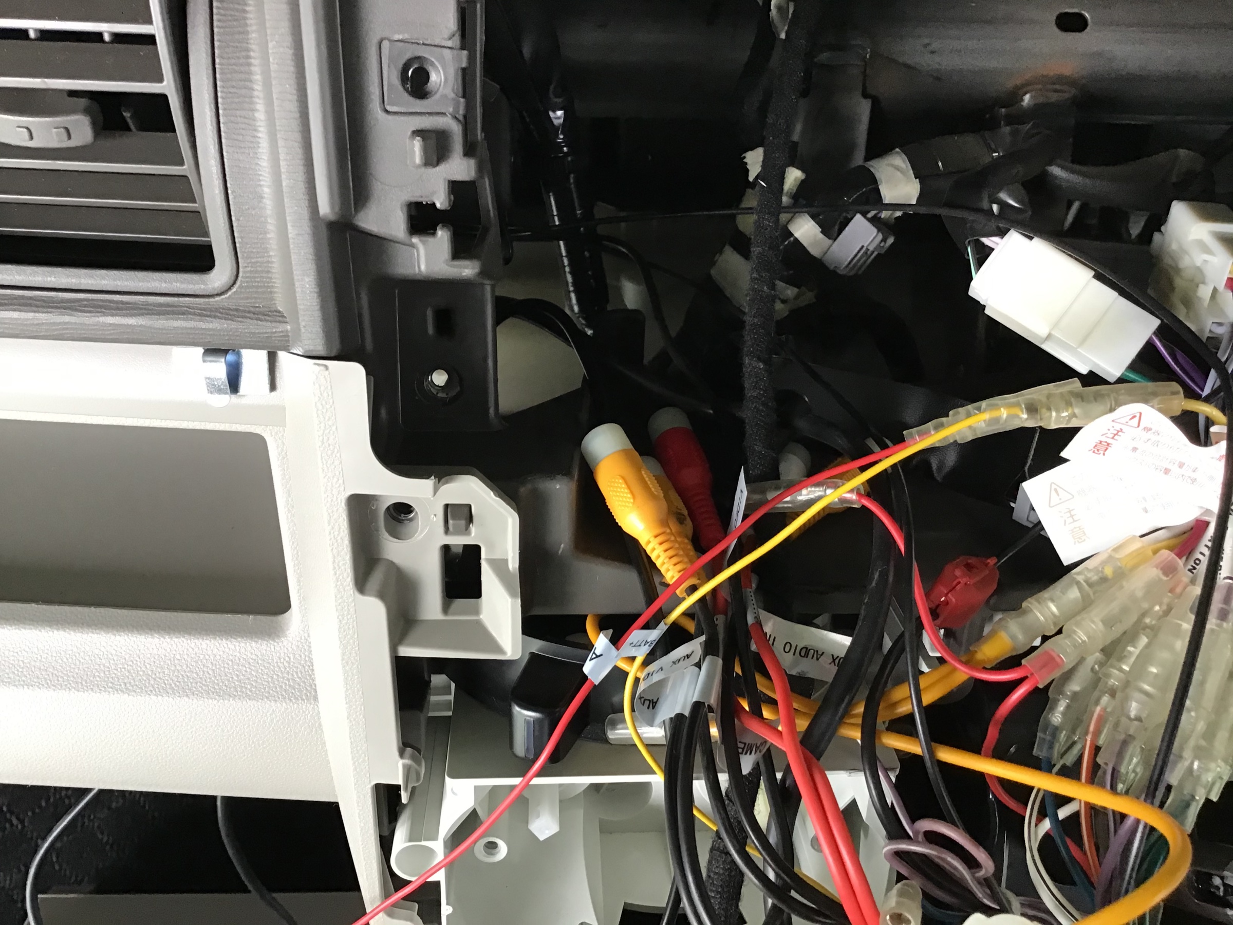 Aピラーを外しフロント、リアカメラの配線を通します。