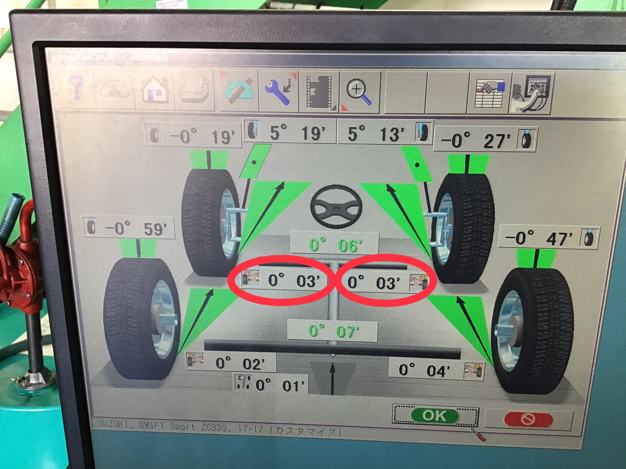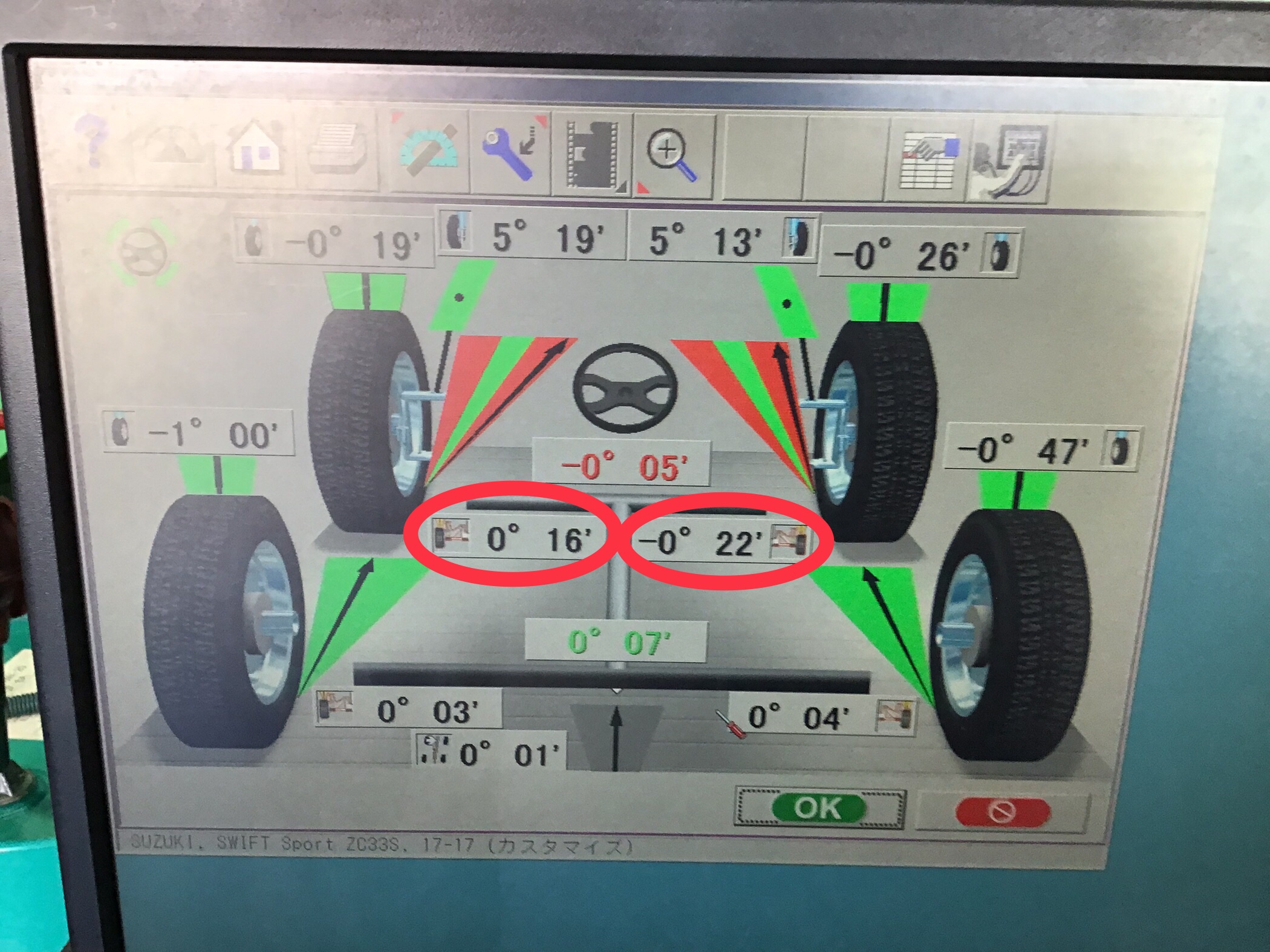 本日はスイフトスポーツのアライメント作業をご紹介します。