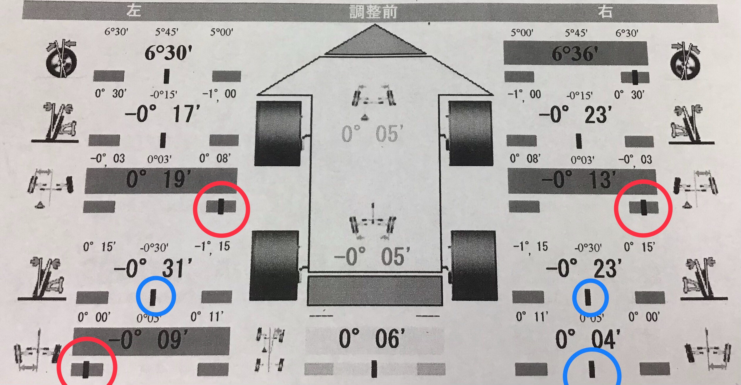後ろのキャンバー2箇所と右後ろのトーは、基準値内。