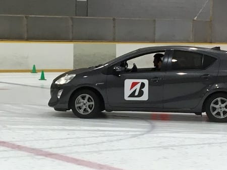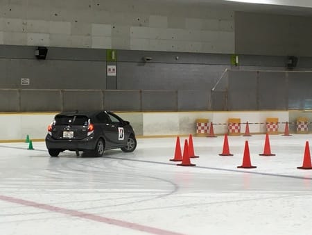 試験車はアクアとセレナにて行いました。スケートリンクの上を試乗するのですが