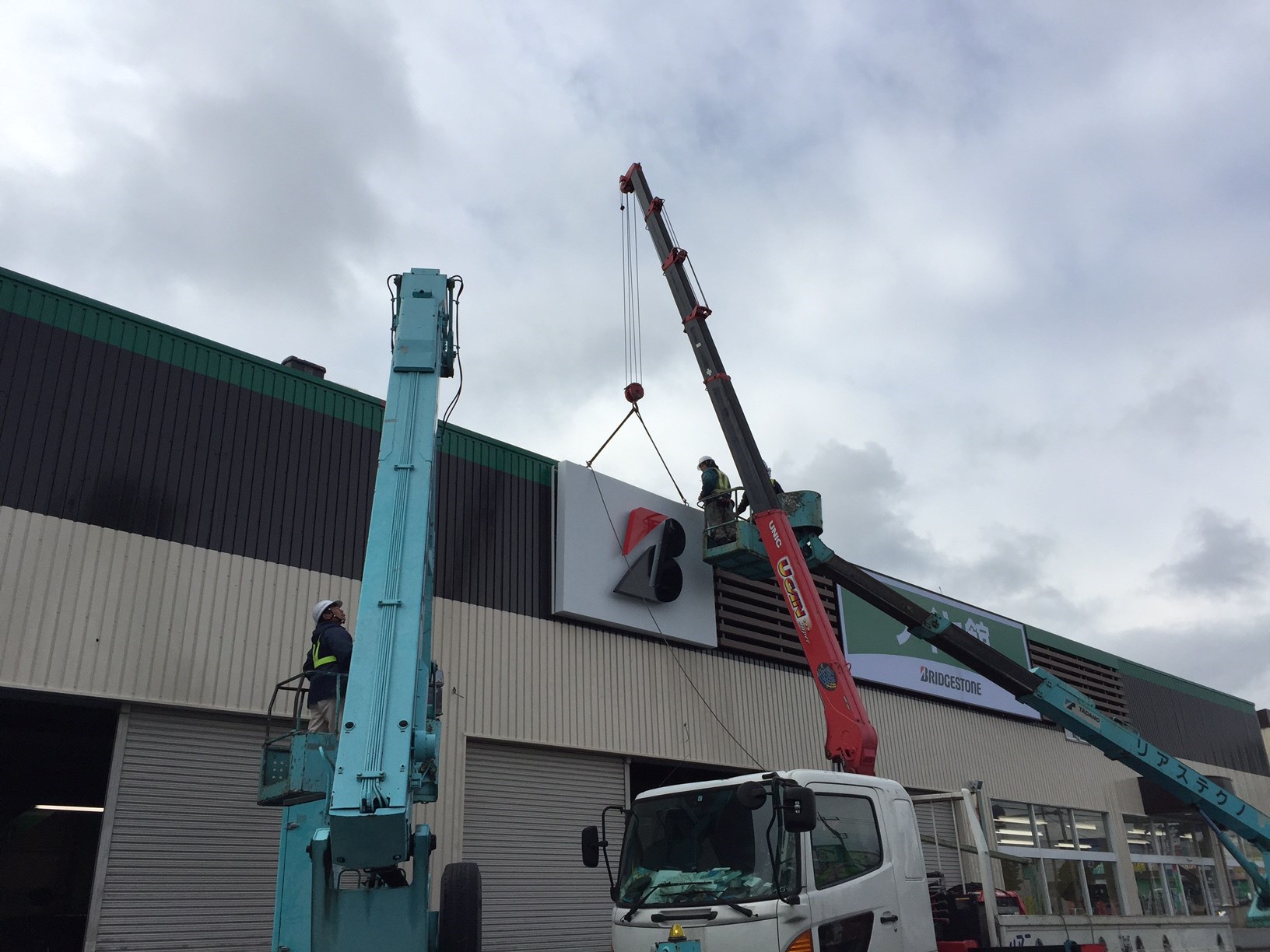 新しいタイヤ館ロゴの看板とブリヂストンのBマークの取り付け中!