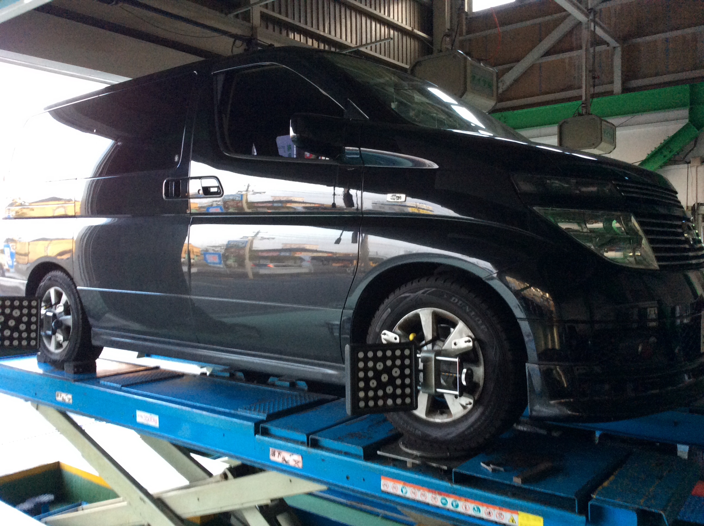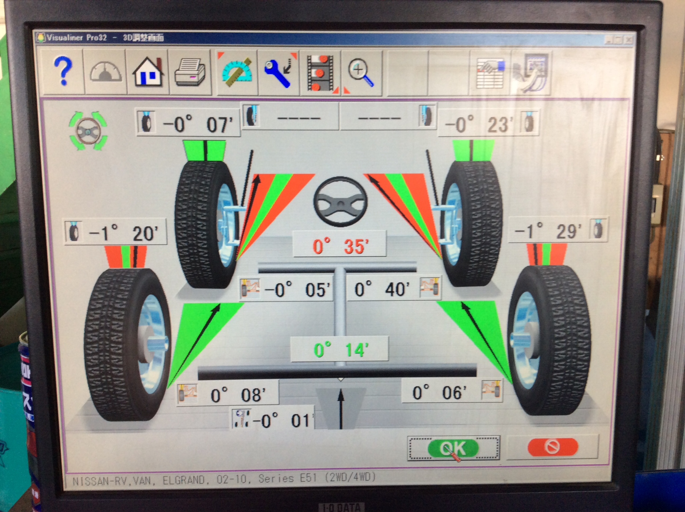 リアキャンバーは古くて重い車なので調整範囲いっぱいまで調整してバランスよく、フロントトーはバッチリです!