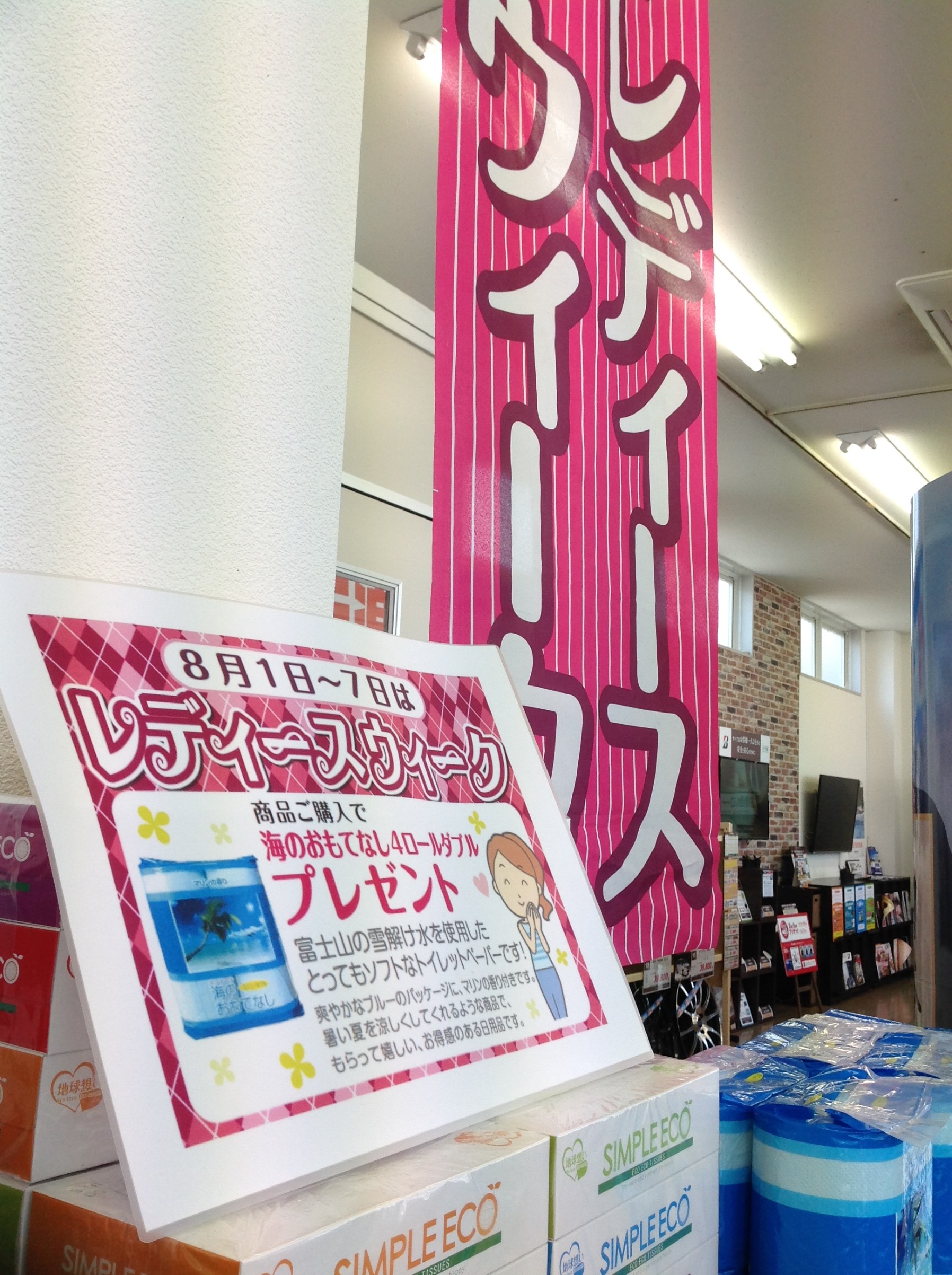 女性の方なら来店いただくだけで、富士山の雪解け水を使用した『海のおもてなし4ロールダブル』をプレゼントいたしますので、お車でちょっと気になるところがある方や最近空気圧の点検をされてない方はそれだけでもいらっしゃってください。