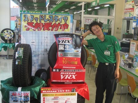 写真はスタッドレスを展示している小野スタッフです。