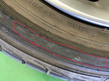 みなさんこんにちは!! タイヤ館厚木店 ざわちんです(^^)/ まずは、こちらをご覧ください! 赤で囲った所 削れてしまっています(;^_^A 全体図はこちら 一周 ぐるっと線が入っていますね これは 引きずり といってタイヤが重さに耐えきれず 損傷してしまっている状態です ちなみに中を開けると、中...