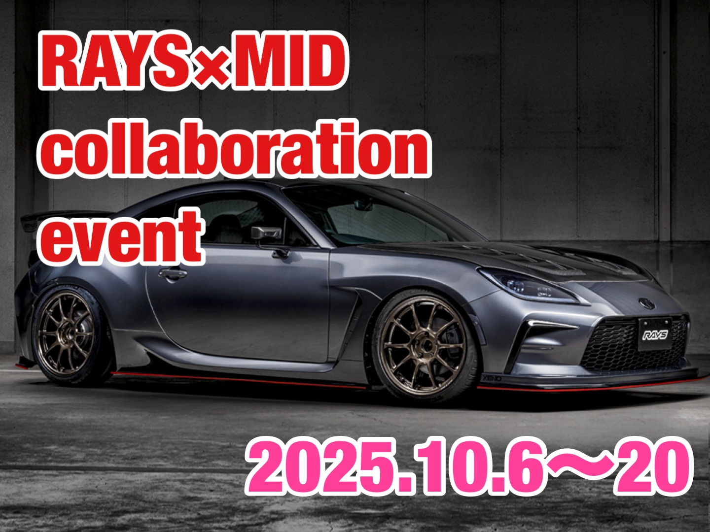 みなさんこんにちは!! イベント担当のざわちんです!! 今年ラストのホイールイベント開催決定しました!!( *´艸`) RAYS×MID ホイールイベント! 期間は 10/6~10/20 となります 今回展示するホイールは6種類! RAYS 【VOLKRACING ZE40】 【A・LAP 08X】 【HOMURA 2X7FA-C】 MID...