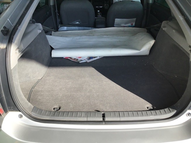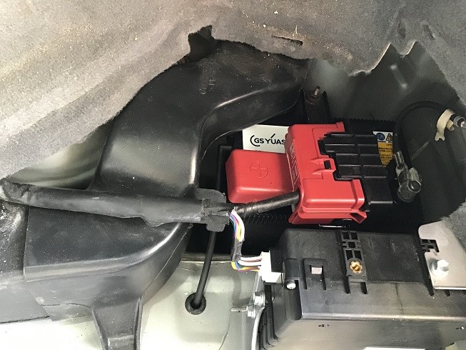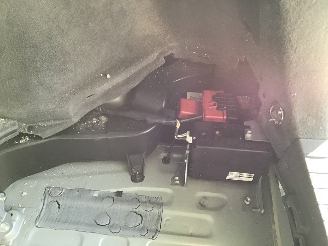 マットをめくり、車載工具の入ったトレイを外して向かって右側の奥に補機バッテリーがあります。