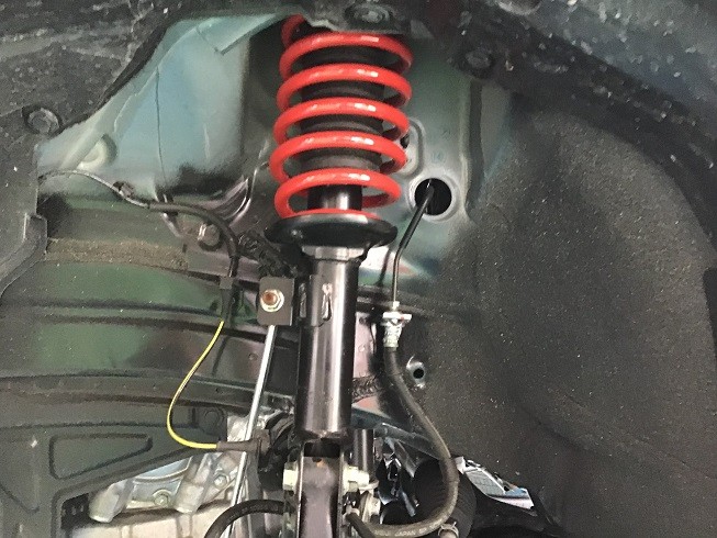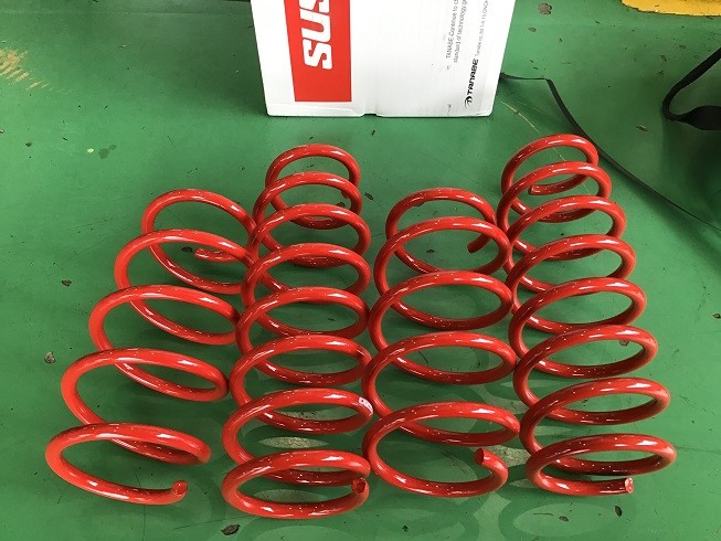 交換する足回りはタナベのUP210です。3cmほどのリフトアップする車検対応パーツで人気の商品。早速交換に入ります。