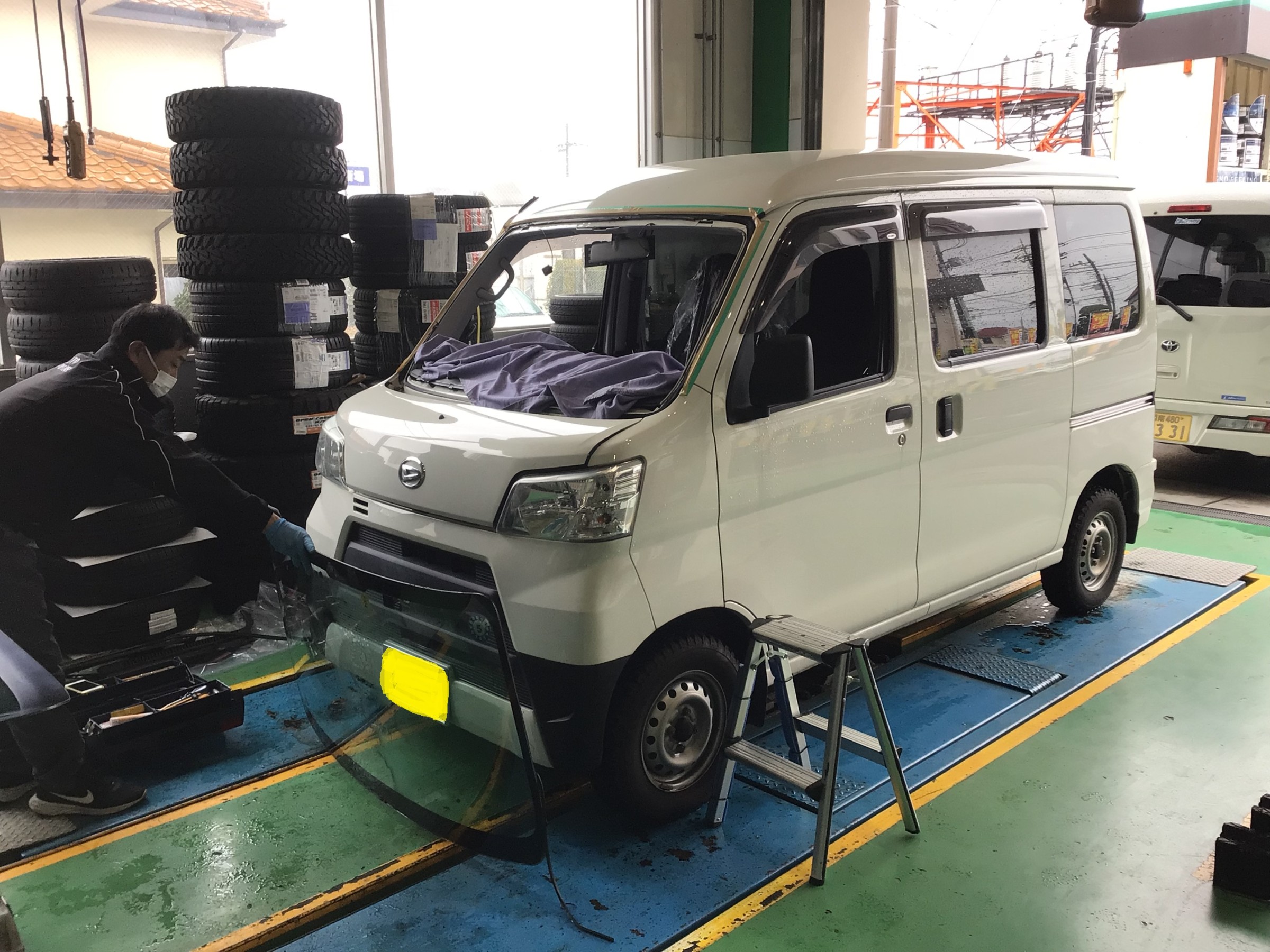 飛び石にてフロントガラスが割れてしまったハイゼット。
