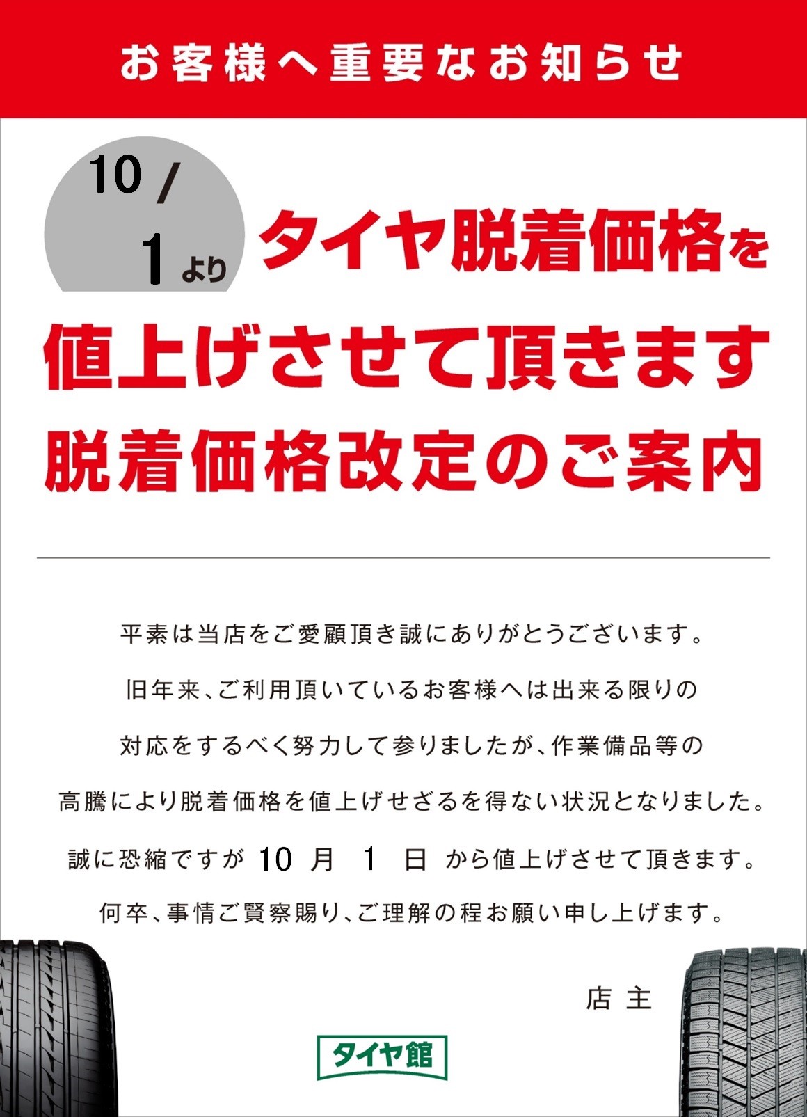 ※※お客様へ重要なお知らせ※※ ポスト 2023年9月16日 平素は当店をご利用いただき誠にありがとうございます。 旧年来、ご利用頂いているお客様へは出来る限りの 対応をするべく努力して参りましたが、作業備品等の 高騰により脱着価格を値上げせざるを得ない状況となりました。 誠に恐縮ですが 10月 1日から値上げさせて頂きます。 何卒、事情ご賢察賜り、ご理解の程お願い申し上げます。 タイヤ館 綾瀬店 店長 カテゴリ:お知らせ