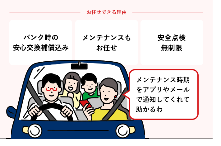 パンク時に安心なタイヤ交換補償に加え、購入後の手厚いタイヤメンテナンスが含まれているためプランに応じて各種メンテナンスをお手ごろな価格で気軽に受けることができます。