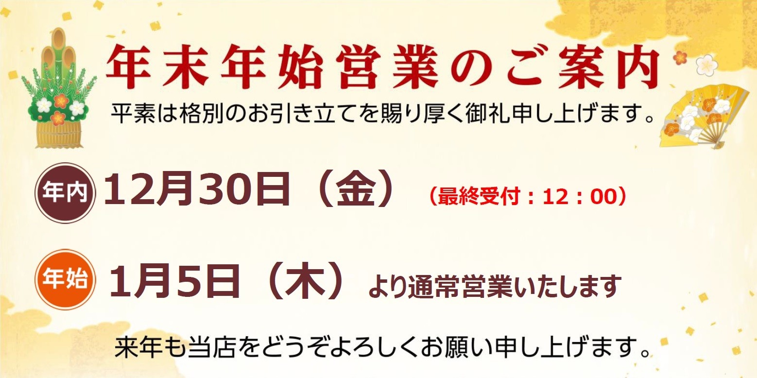 年末年始のご案内。 ポスト 2025年12月30日 年末年始のご案内になります。 年末年始は5日間のお休みを頂いております 当店は、年末年始の休業日といたしまして 12月31日(火) 1月1日(水) 1月2日(木) 1月3日(金) 1月4日(土) の5日間を、休業日とさせて頂きます。 年始営業(初売り)は 1月5日(日)10:30から となります。 お休みの期間、大変ご不便ご迷惑をお掛け致しますが 何卒、ご了承の程よろしくお願いいたします。 ごあいさつ 今年1年も、タイヤ館 綾瀬 をご贔屓に頂き ありがとうございました。 また2025年、令和7年度も 当店スタッフ一同、お客様のご来店を 心よりお待ちしております。 タイヤ館 綾瀬 住所:252-1108神奈川県綾瀬市深谷上1-6-2 電話番号: 0467-79-5660 カテゴリ:その他