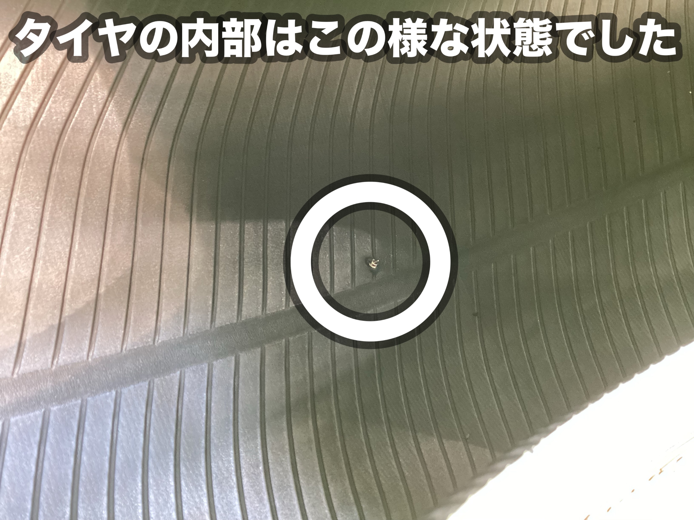 貫通個所とタイヤの内部の状況を確認していきます。