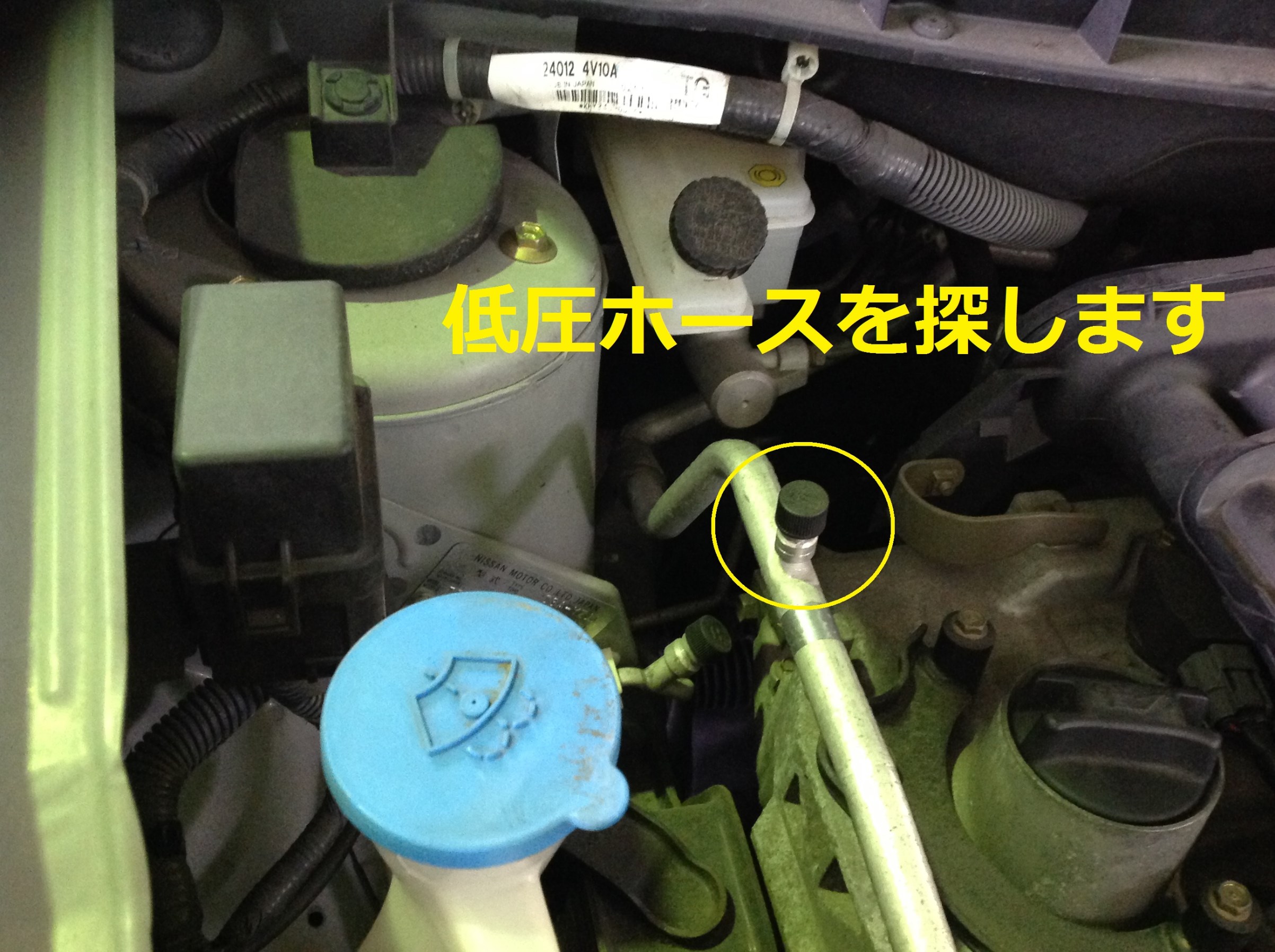 まずは、エアコンの低圧ホースを探します。