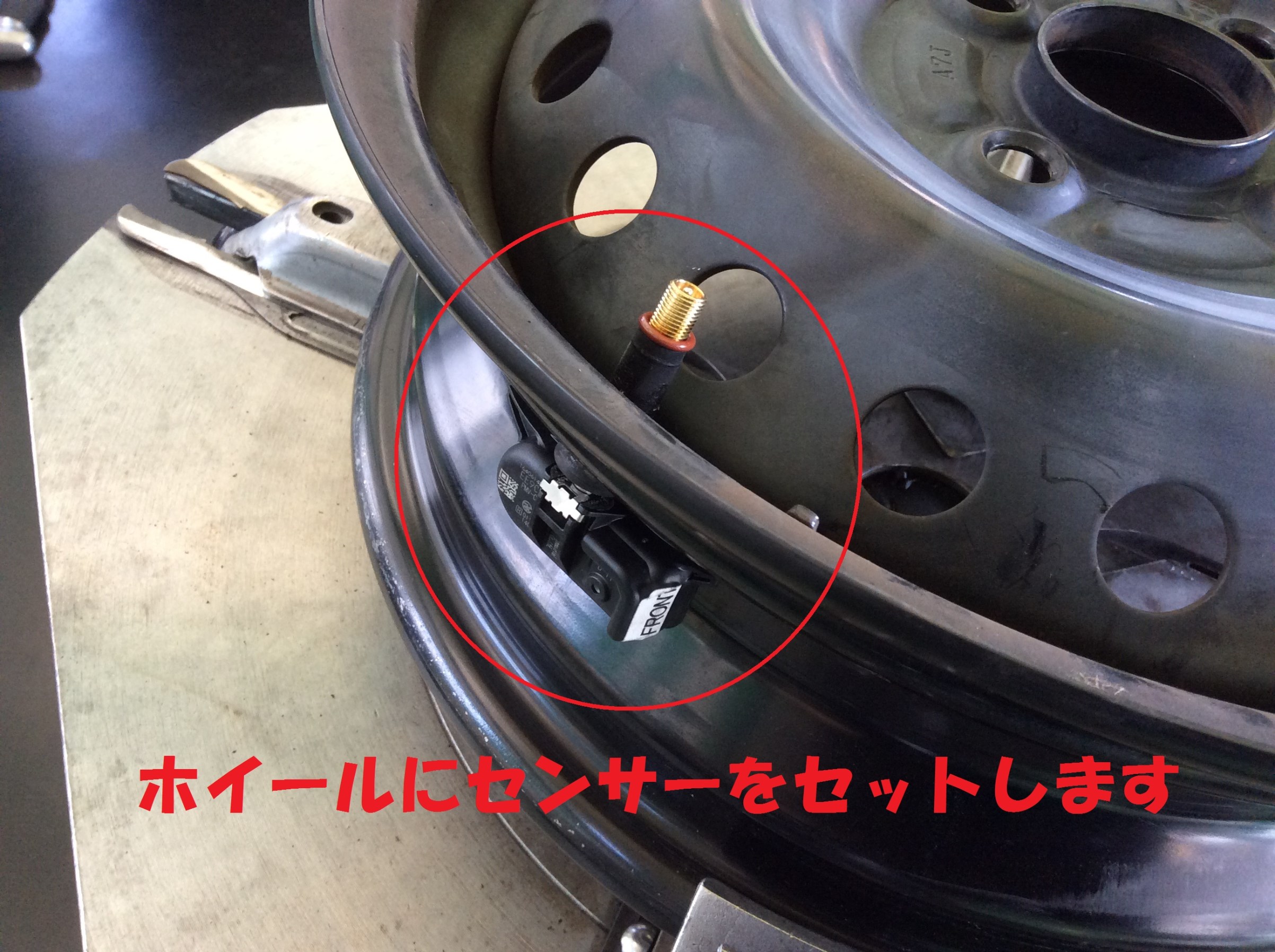 1)ホイールにセンサーを付けます