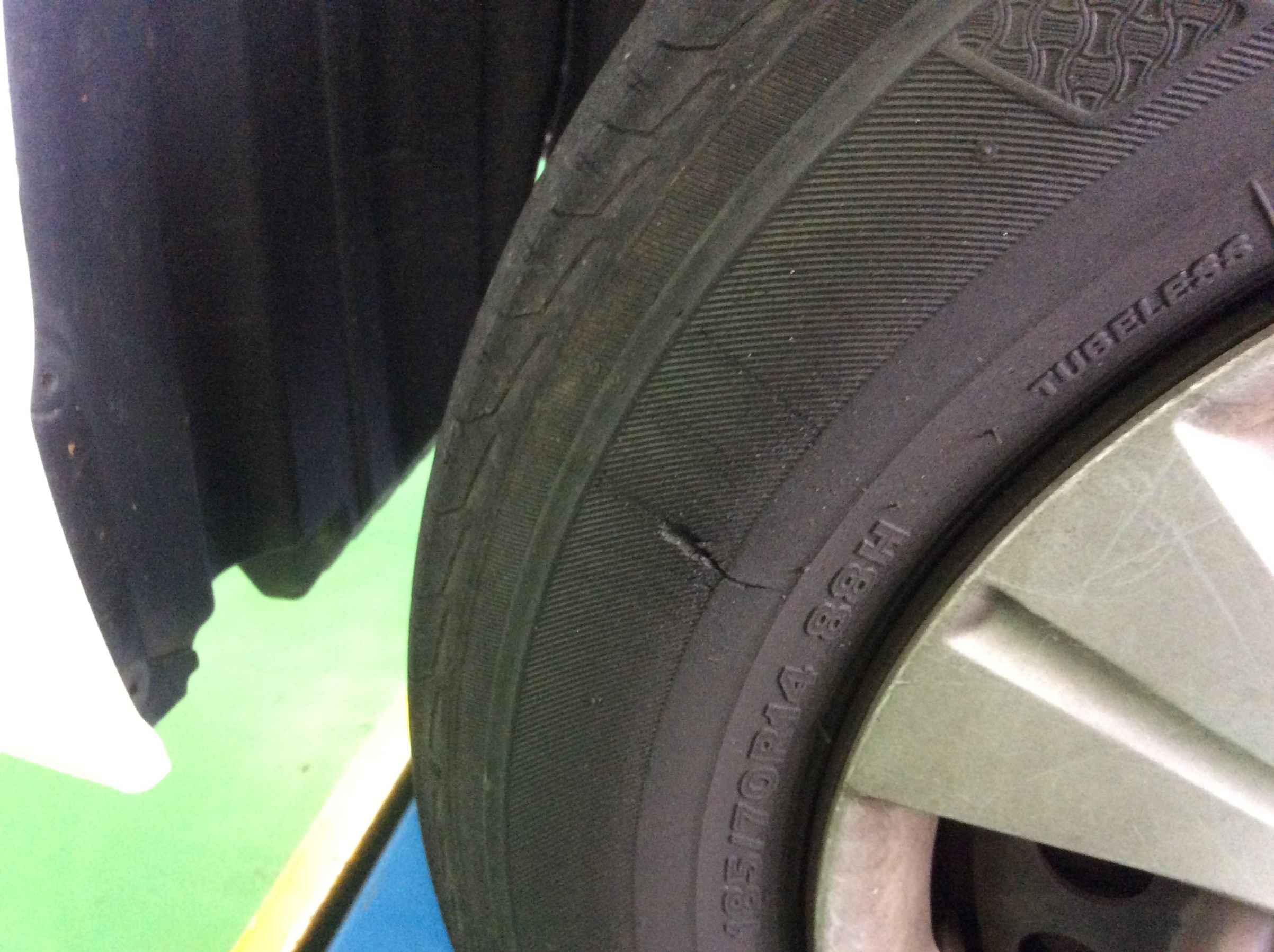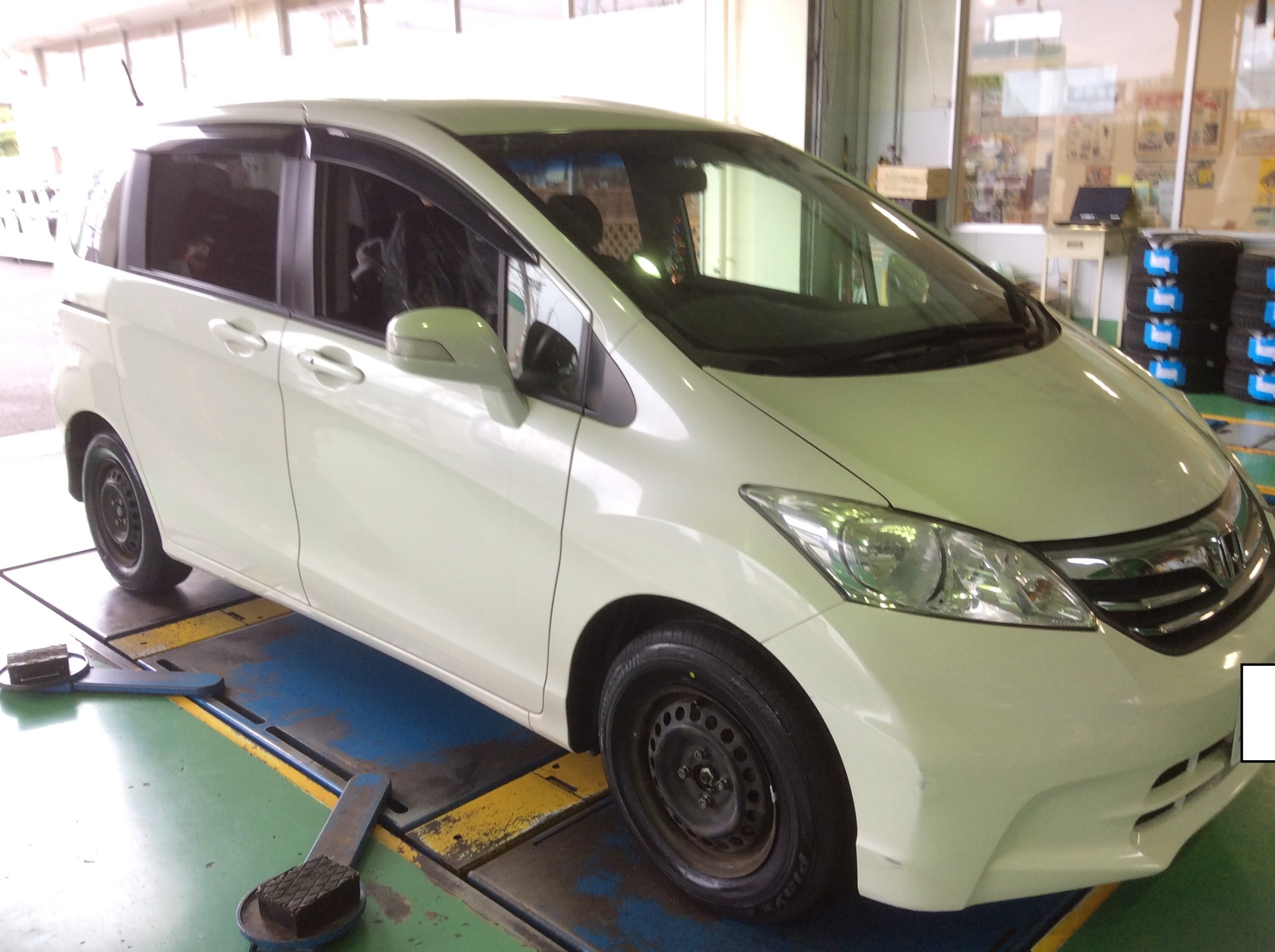 さてさてそんな中、フリードさんがタイヤ交換にご来店です!じつは先週にオイル交換にご来店いただいたのですが空気圧点検中にタイヤの傷を発見して本日のタイヤ交換となりました。