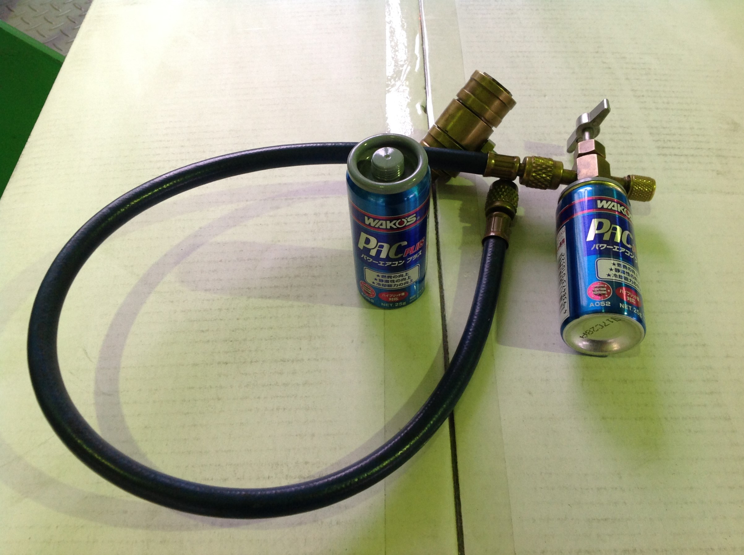 「添加剤5グラム」←(コンプレッサーの動きを良くする物)が入っております!こんな感じでエアコンガスの低圧パイプに繋げて入れていきます。
