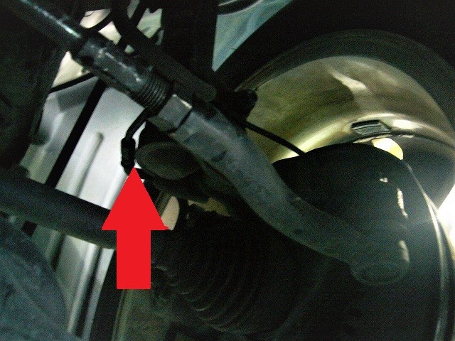 調整が必要なフロントトーは矢印部分のステアリングタイロッド部を調整し変更します。