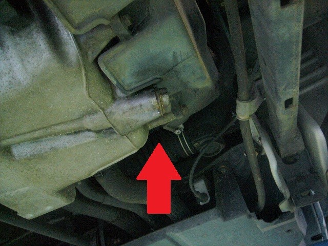 オイルを下抜きします。矢印の部分がドレンボルトです。アタマは24mmと大型サイズ。