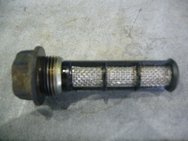 こちらは外したドレンボルトです。先にはストレーナーが取り付けてあり、こちらも洗浄しドレンパッキンを交換しトルクレンチを用いて取り付けします。