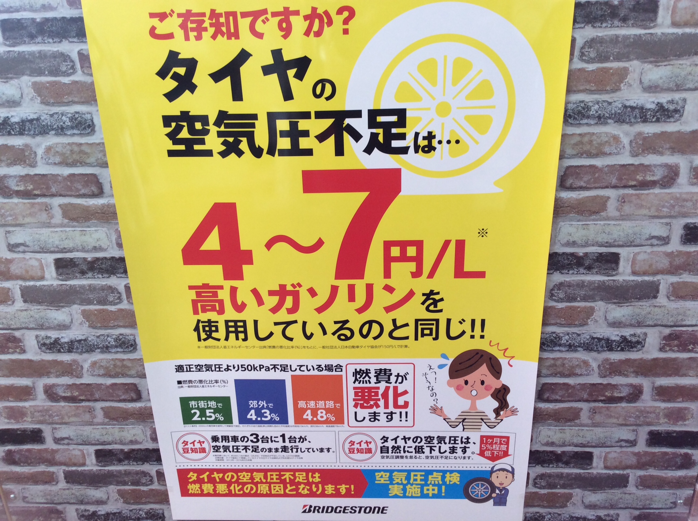 ご存知ですか? ポスト 2021年4月23日 タイヤの空気圧が不足しているとお財布にもダメージがあるんです(*_*) あとタイヤの偏摩耗にも繋がります! 空気圧はマメにチェックしましょう! タイヤ館では無料で点検を行います!時間も5分程度なのでどうぞお気軽にお寄り下さい(^^) 担当:日没くん
