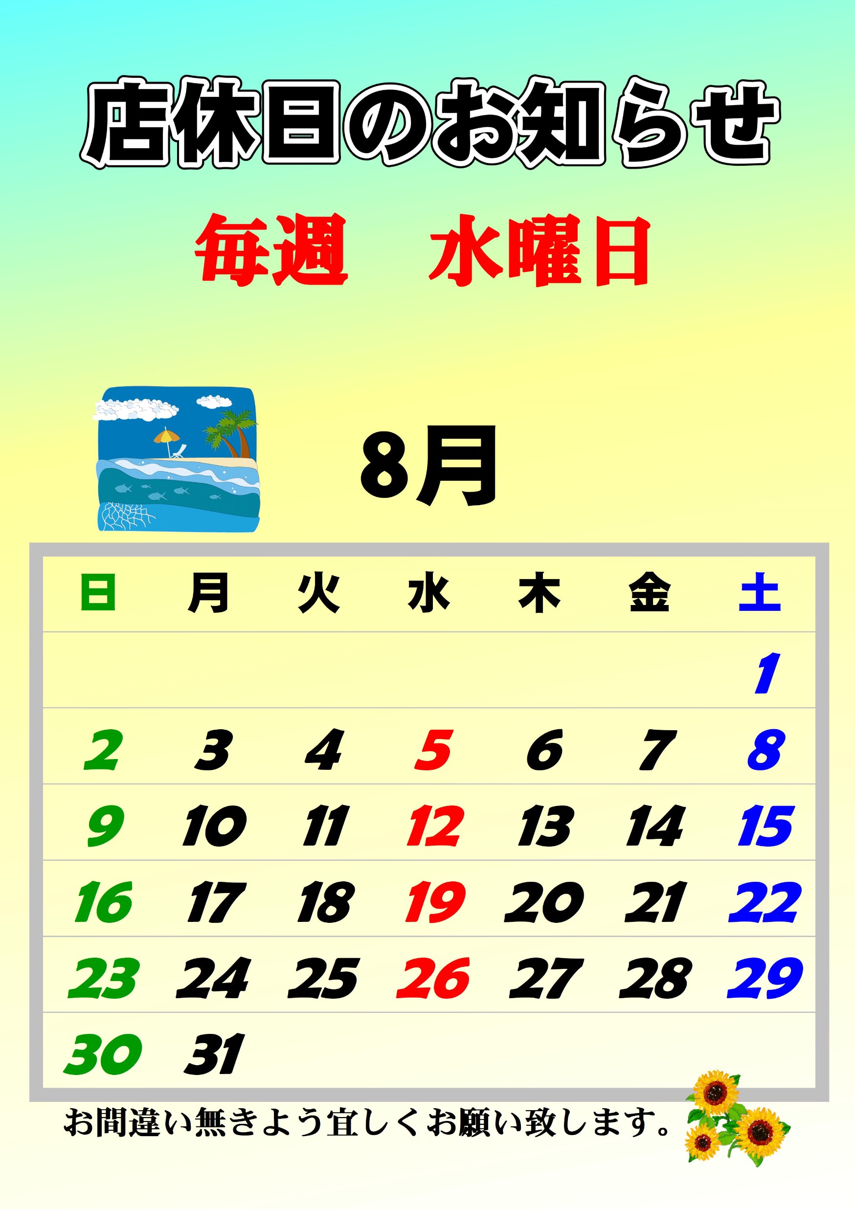 8月店休日のお知らせ。 ポスト 2020年8月1日 タイヤ館別府店のHPをご覧頂き、誠にありがとうございます! 8月の店休日は5、12、19、26日となります。 営業時間は10:30~19:00(作業受付~18:00)です。 皆様のご来店スタッフ一同、心よりお待ちしております。 カテゴリ:お知らせ
