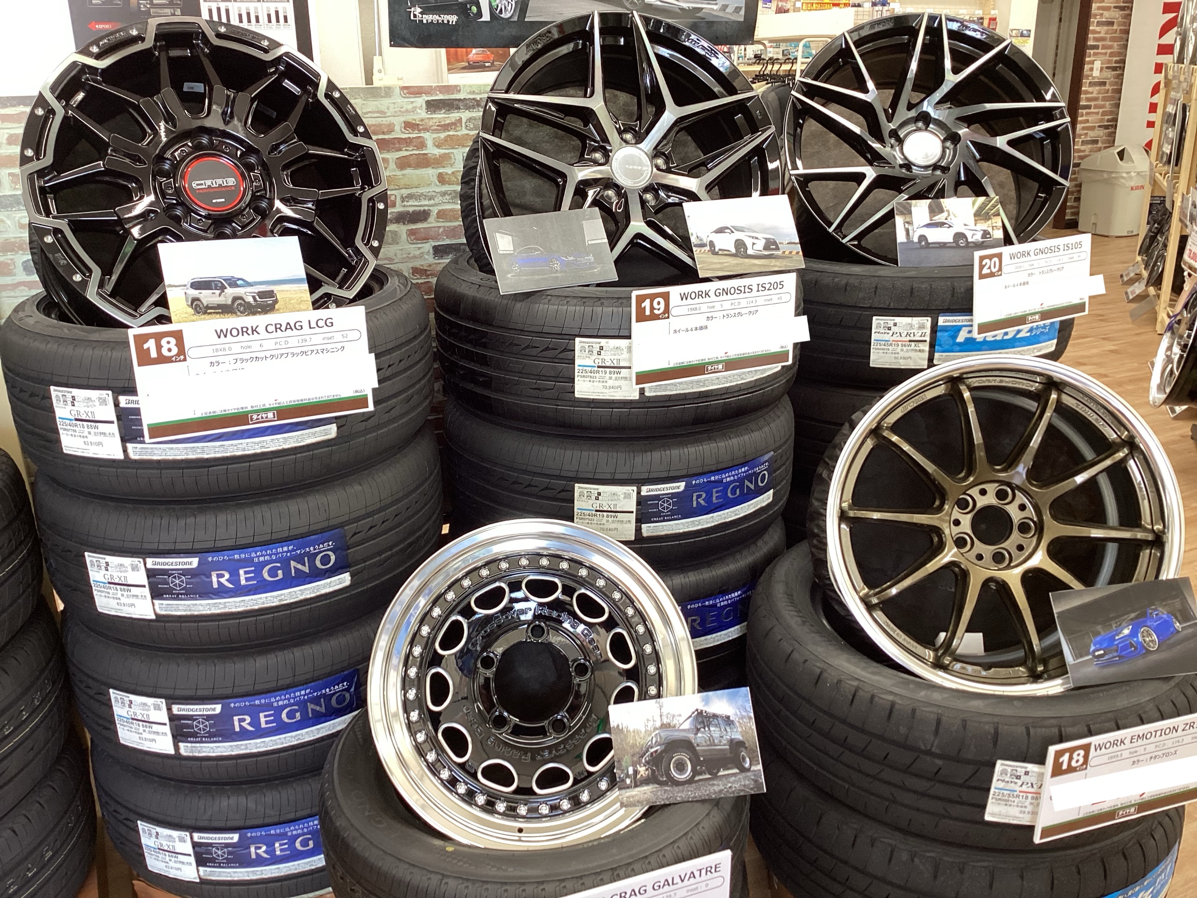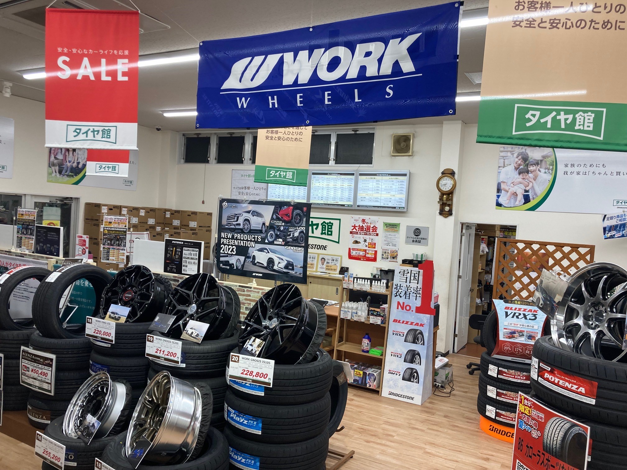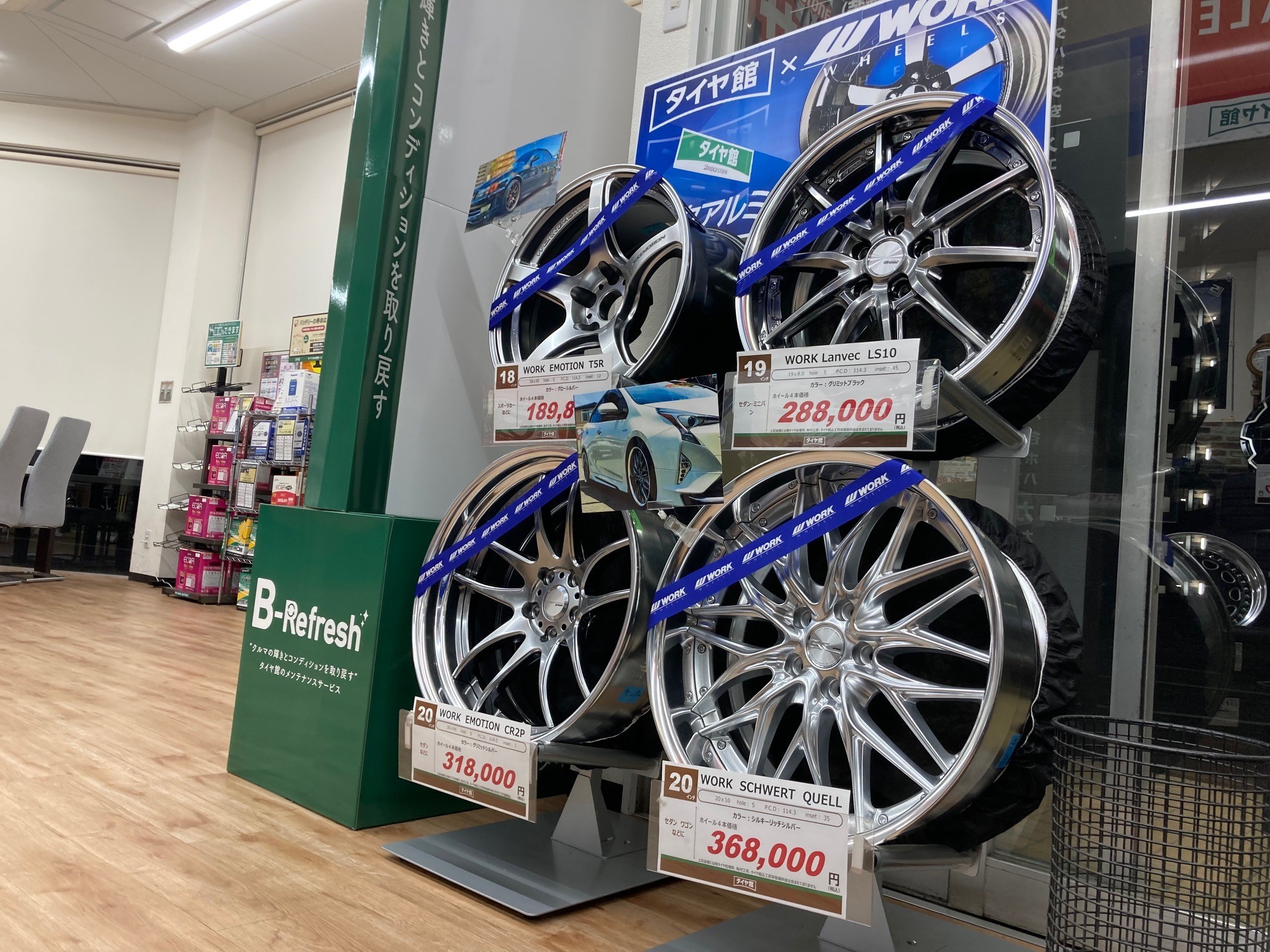 現在開催中のアルミホイールキャンペーンで店内出入り口にWORKホイールコーナーを設置しています!